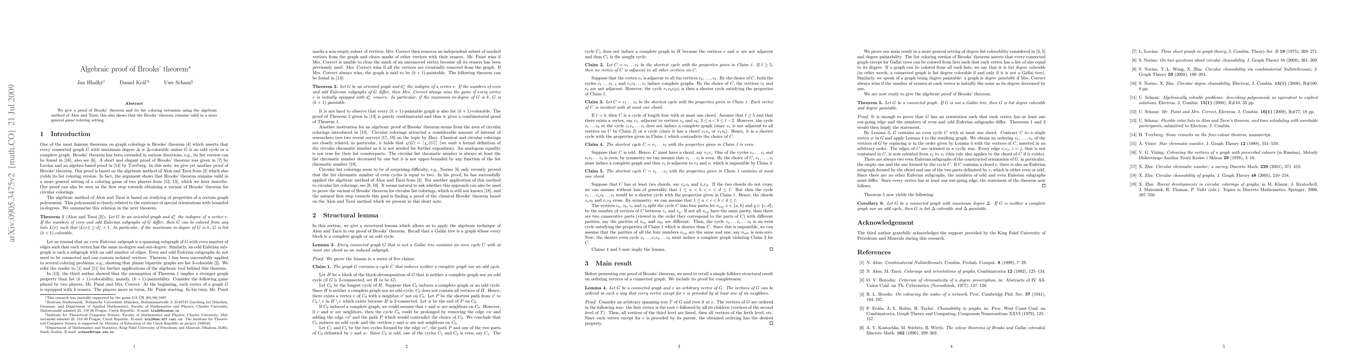 Summary: This paper provides an algebraic proof of Brooks' theorem and its list coloring extension, demonstrating the theorem's validity within a broader game coloring framework using the Alon-Tarsi method.