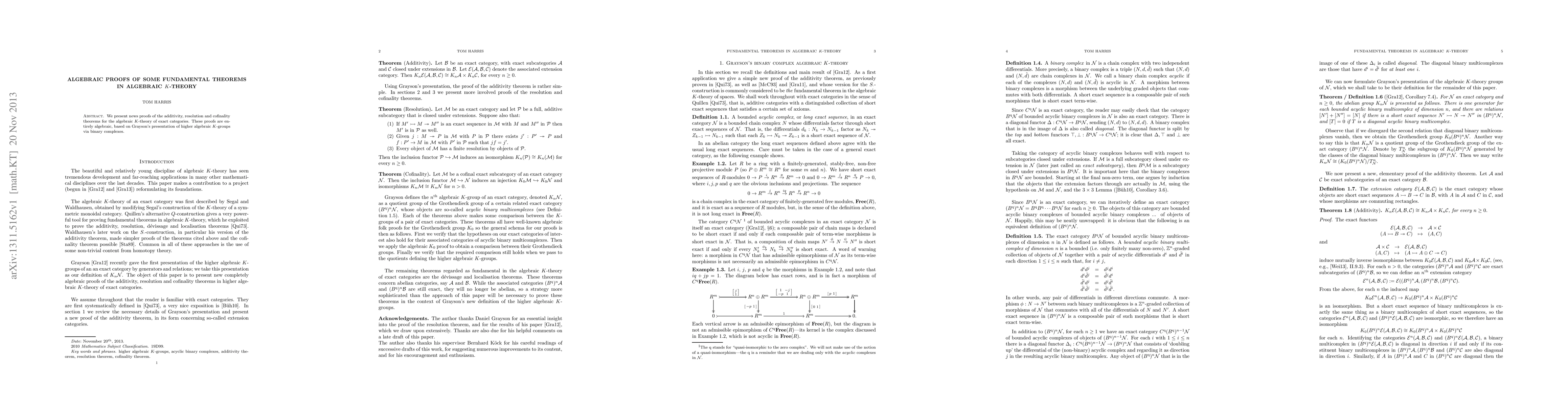 We present news proofs of the additivity, resolution and cofinality theorems for the algebraic $K$-theory of exact categories. These proofs are entirely algebraic, based on Grayson's presentation of higher algebraic $K$-groups via binary complexes.