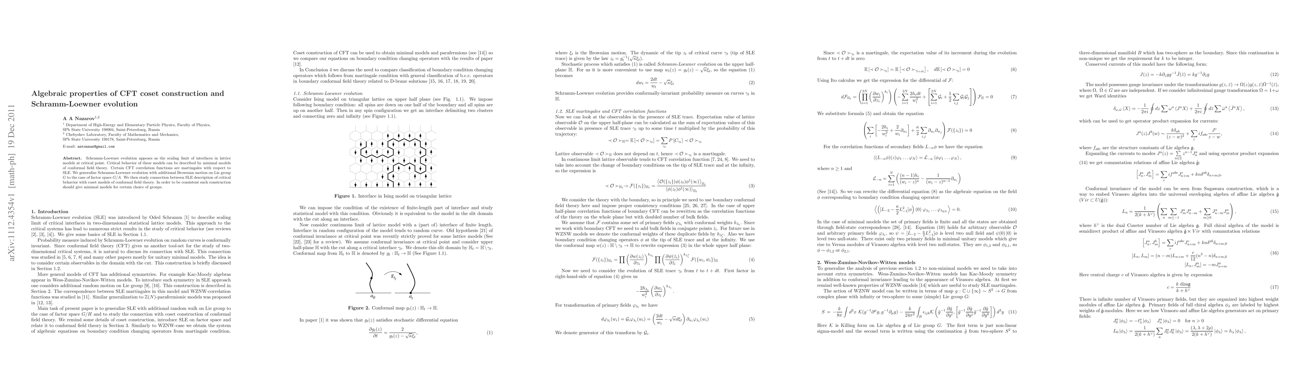 This paper explores the algebraic properties of CFT coset constructions and their relation to Schramm-Loewner evolution (SLE). It generalizes SLE with Brownian motion on Lie groups to factor spaces, examining how this connects to the critical behavior described by coset models in conformal field theory.