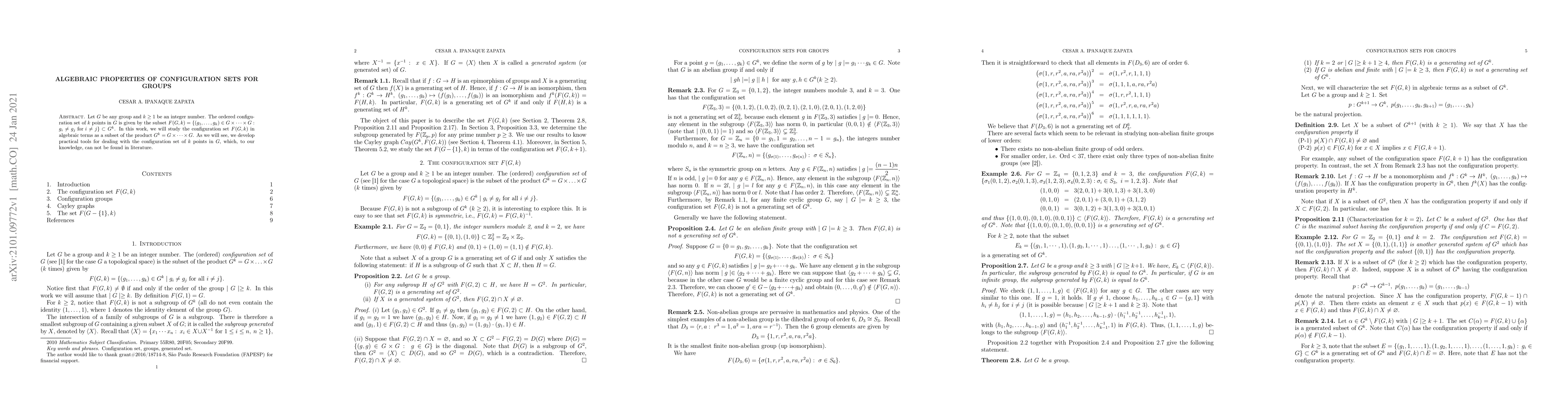 Let $G$ be any group and $k\geq 1$ be an integer number. The ordered configuration set of $k$ points in $G$ is given by the subset $F(G,k)=\{(g_1,\ldots,g_k)\in G\times \cdots\times G: g_i\neq g_j \text{ for } i\neq j\}\subset G^k$. In this work, we will study the configuration set $F(G,k)$ in algebraic terms as a subset of the product $G^k=G\times \cdots\times G$. As we will see, we develop practical tools for dealing with the configuration set of $k$ points in $G$, which, to our knowledge, can not be found in literature.
