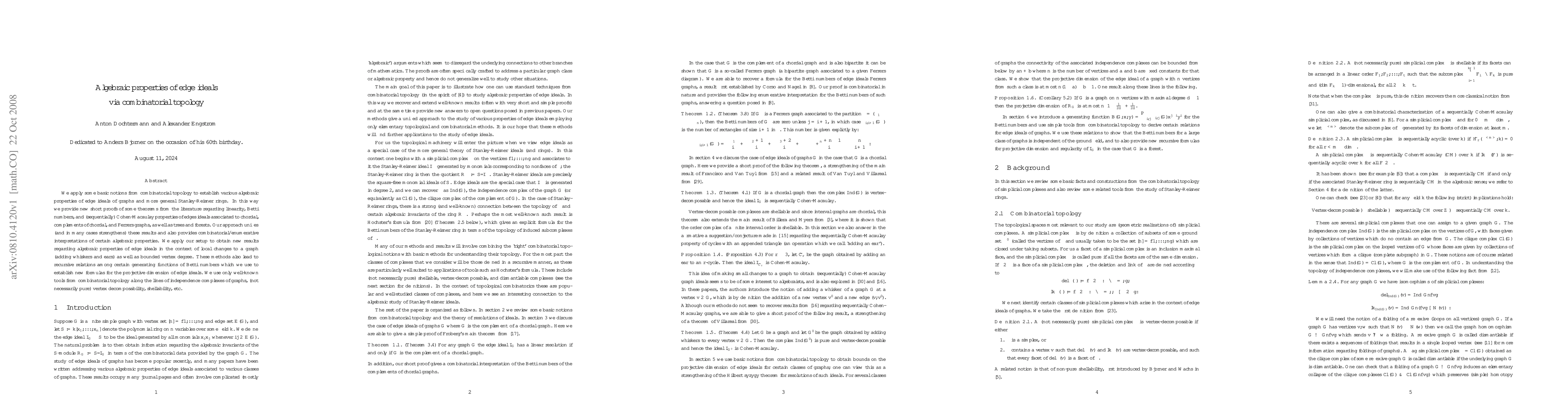 This paper uses combinatorial topology to derive algebraic properties of edge ideals in graphs, unifying existing results on linearity, Betti numbers, and Cohen-Macaulay properties for various graph types. It also establishes new recursive relations and formulas for projective dimension, leveraging well-known topological tools.