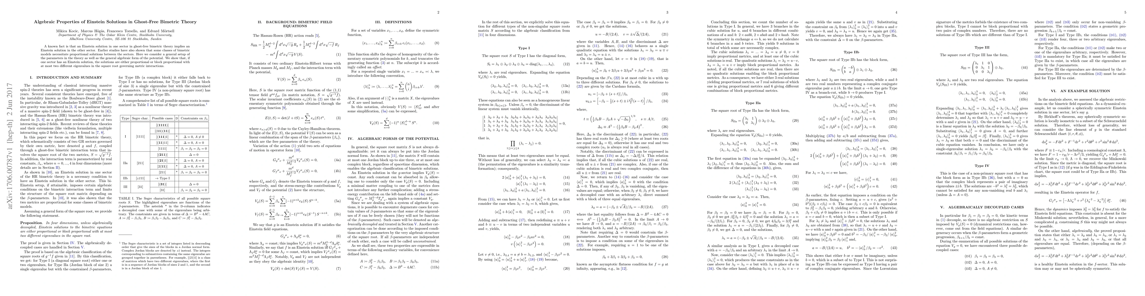 A known fact is that an Einstein solution in one sector in ghost-free bimetric theory implies an Einstein solution in the other sector. Earlier studies have also shown that some classes of bimetric models necessitate proportional solutions between the sectors. Here we consider a general setup of the parameters in the theory as well as the general algebraic form of the potential. We show that, if one sector has an Einstein solution, the solutions are either proportional or block proportional with at most two different eigenvalues in the square root governing metric interactions.