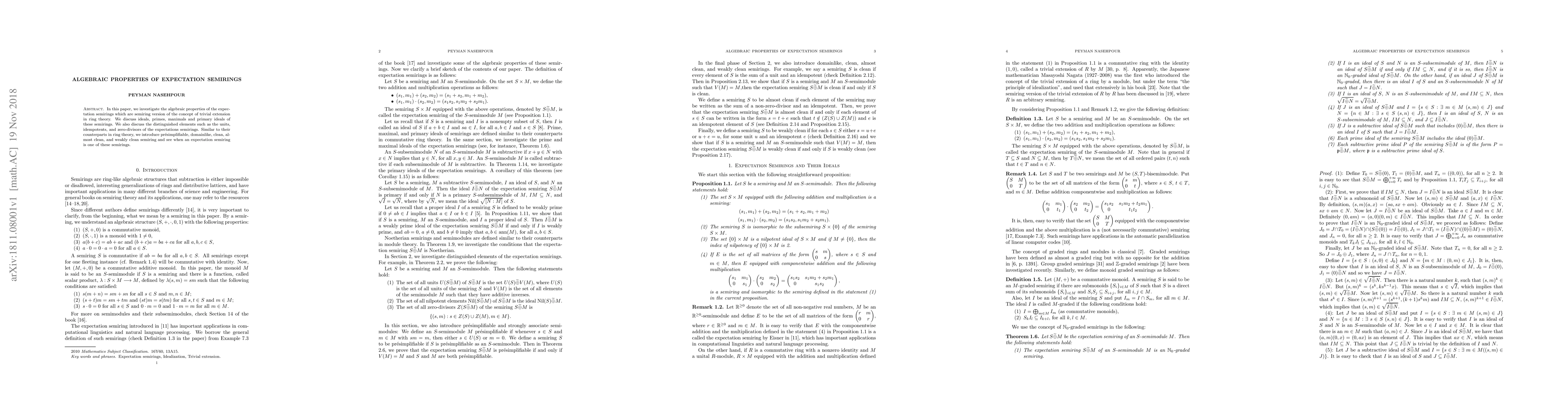 This paper explores the algebraic properties of expectation semirings, focusing on their ideals, prime, maximal, and primary characteristics. It also examines distinguished elements like units, idempotents, and zero-divisors, and introduces various types of semirings parallel to those in ring theory.