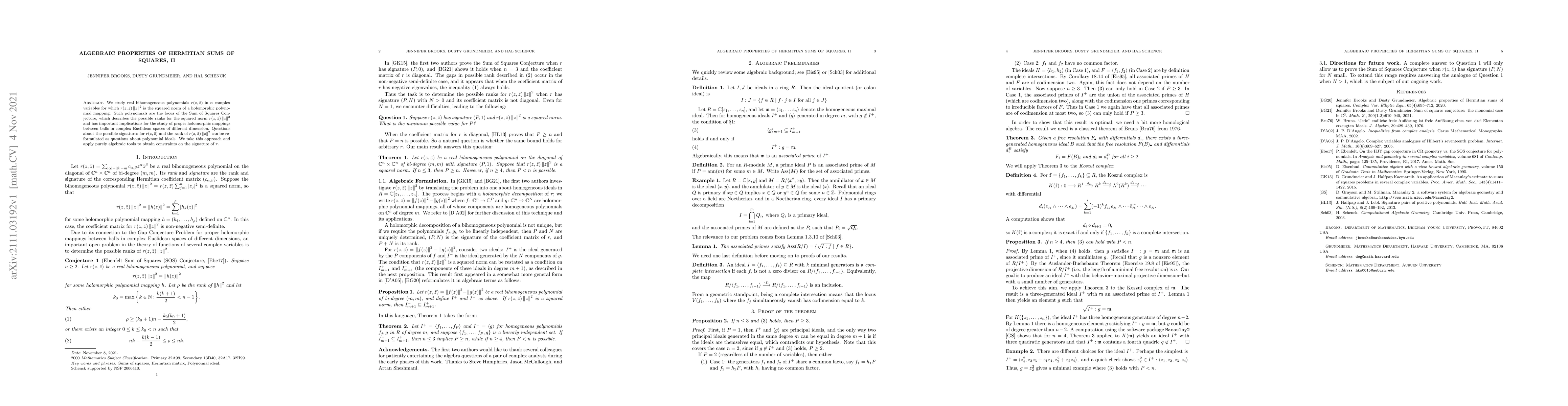 We study real bihomogeneous polynomials $r(z,\bar{z})$ in $n$ complex variables for which $r(z,\bar{z}) \|z\|^2$ is the squared norm of a holomorphic polynomial mapping. Such polynomials are the focus of the Sum of Squares Conjecture, which describes the possible ranks for the squared norm $r(z,\bar{z}) \|z\|^2$ and has important implications for the study of proper holomorphic mappings between balls in complex Euclidean spaces of different dimension. Questions about the possible signatures for $r(z,\bar{z})$ and the rank of $r(z,\bar{z}) \|z\|^2$ can be reformulated as questions about polynomial ideals. We take this approach and apply purely algebraic tools to obtain constraints on the signature of $r$.