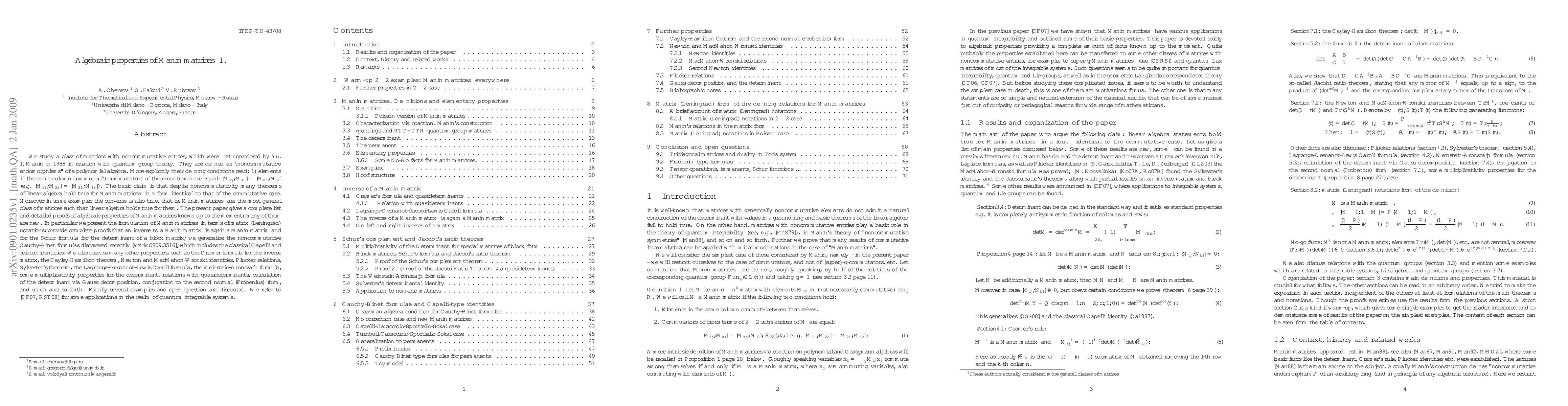 This paper explores the algebraic properties of Manin matrices, noncommutative endomorphisms of polynomial algebras introduced by Yu. I. Manin in 1988. It establishes that many linear algebra theorems hold true for these matrices, providing detailed proofs and generalizations of existing results, including the Schur formula, noncommutative Cauchy-Binet formulas, and various determinant-related identities.