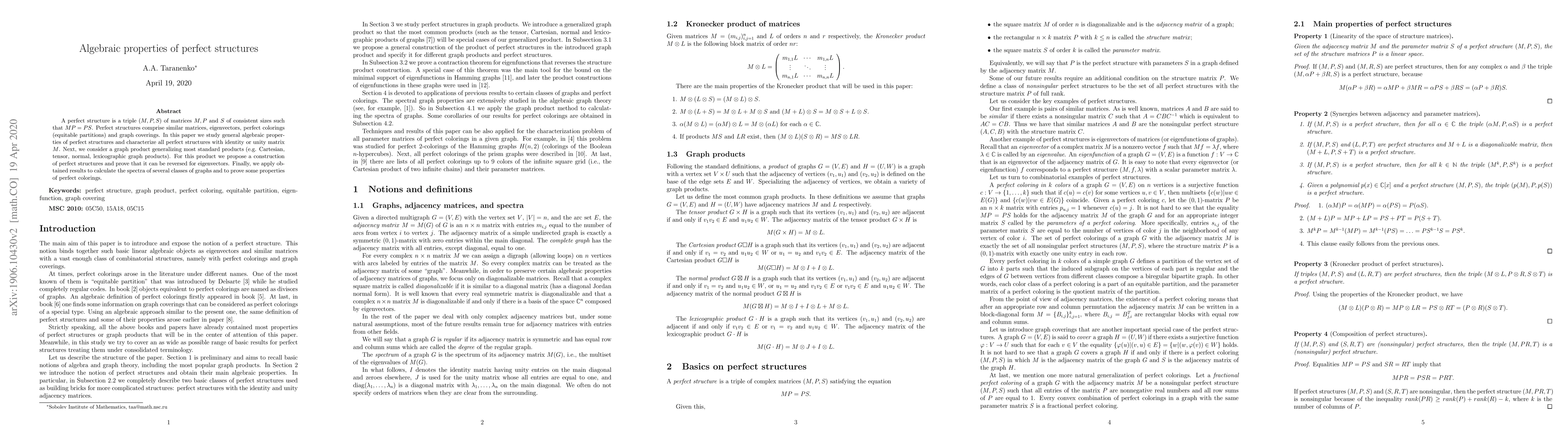 This paper investigates the algebraic properties of perfect structures, defined by the matrix equation $MP = PS$, and characterizes those with identity matrices. It introduces a new graph product and demonstrates its reversibility for eigenvectors, applying these findings to compute spectra of various graph classes and establish properties of perfect colorings.