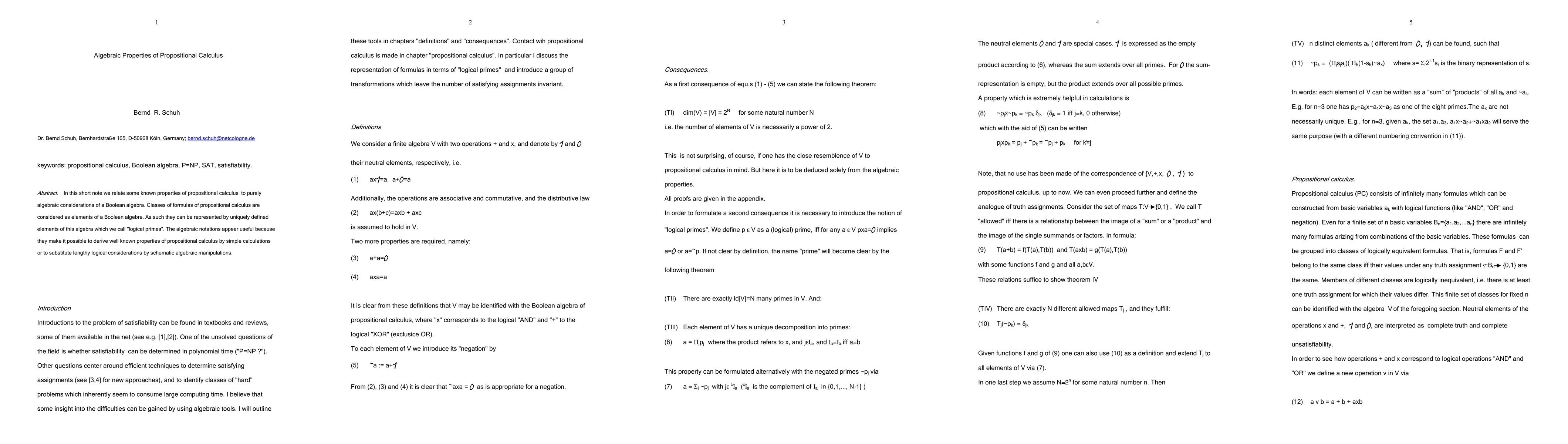 In this short note we relate some known properties of propositional calculus to purely algebraic considerations of a Boolean algebra. Classes of formulas of propositional calculus are considered as elements of a Boolean algebra. As such they can be represented by uniquely defined elements of this algebra which we call "logical primes". The algebraic notations appear useful because they make it possible to derive well known properties of propositional calculus by simple calculations or to substitute lengthy logical considerations by schematic algebraic manipulations.