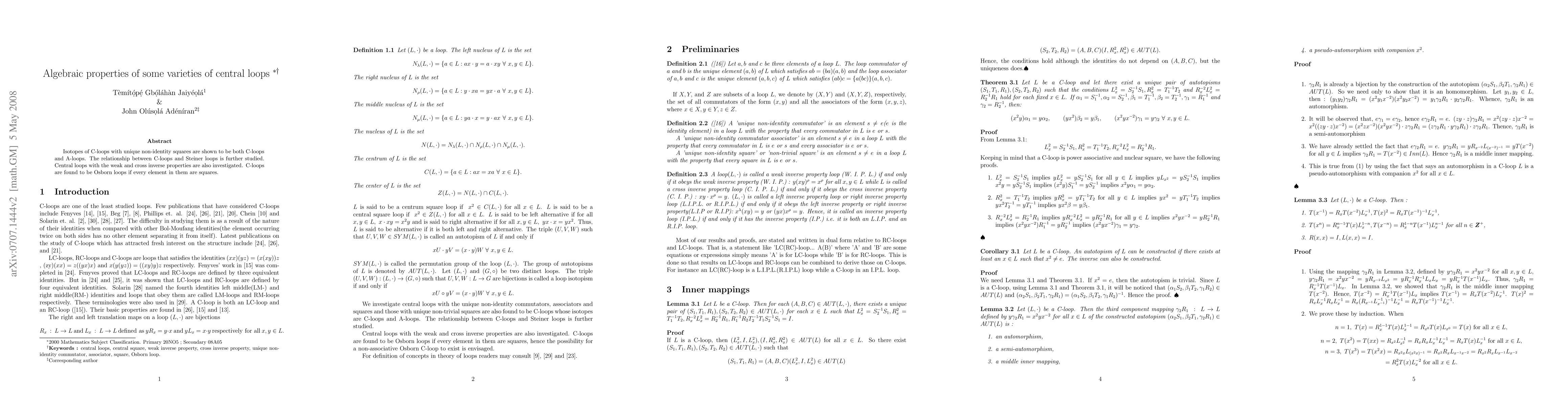This research establishes that specific C-loops, having singular non-identity squares, are also A-loops. It explores the connection between C-loops and Steiner loops, and identifies central loops with weak and cross inverse properties. Crucially, it reveals that C-loops, where all elements are squares, are Osborn loops.