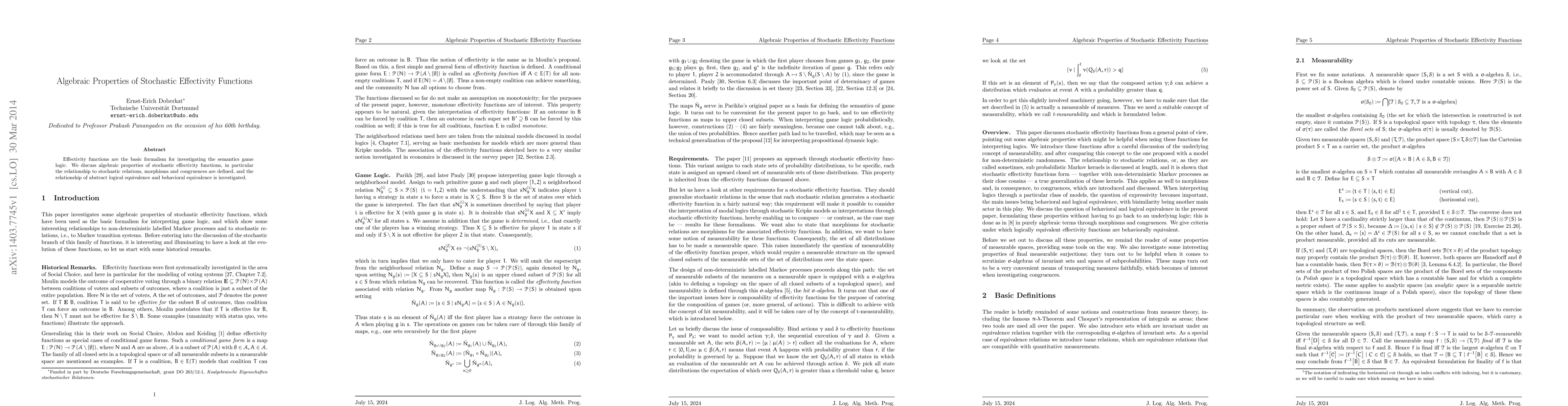 Effectivity functions are the basic formalism for investigating the semantics game logic. We discuss algebraic properties of stochastic effectivity functions, in particular the relationship to stochastic relations, morphisms and congruences are defined, and the relationship of abstract logical equivalence and behavioral equivalence is investigated.