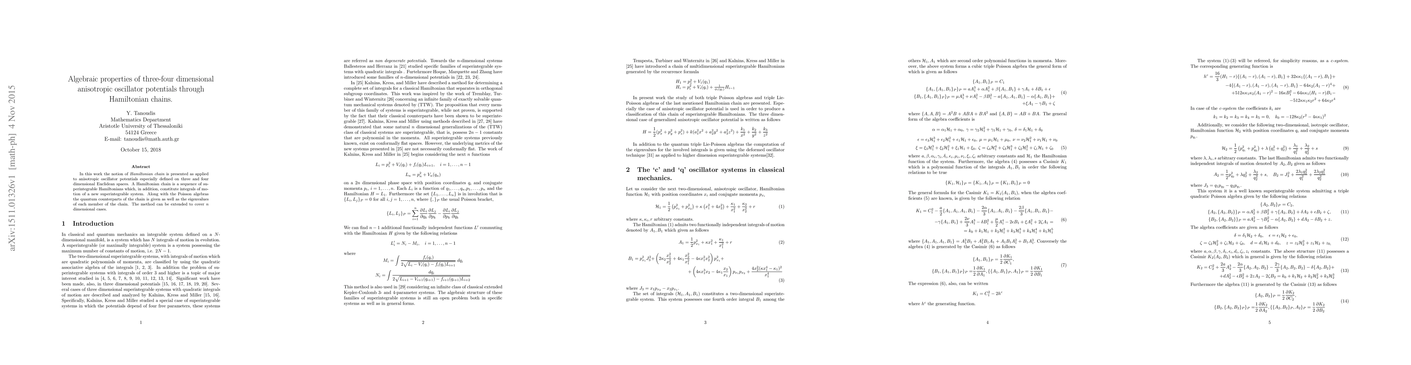 In this work the notion of Hamiltonian chain is presented as applied to anisotropic oscillator potentials especially defined on three and four dimensional Euclidean spaces. A Hamiltonian chain is a sequence of superintegrable Hamiltonians which, in addition, constitute integrals of motion of a new superintegrable system. Along with the Poisson algebras the quantum counterparts of the chain is given as well as the eigenvalues of each member of the chain. The method can be extended to cover n dimensional cases.