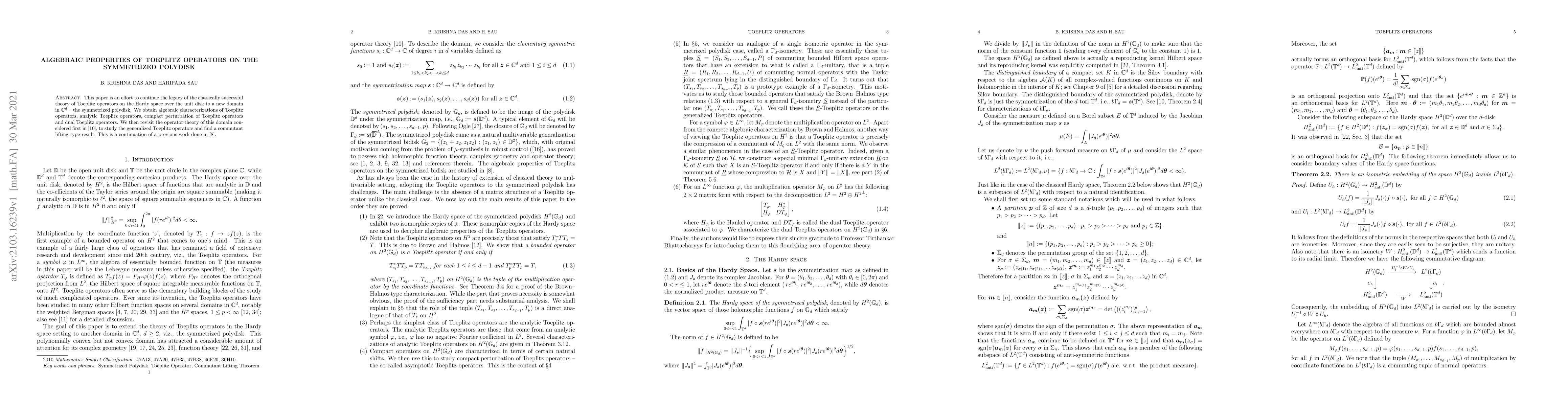 Summary: This paper extends the theory of Toeplitz operators from the Hardy space over the unit disk to the symmetrized polydisk in $\mathbb C^d$, exploring their algebraic properties in this new setting.