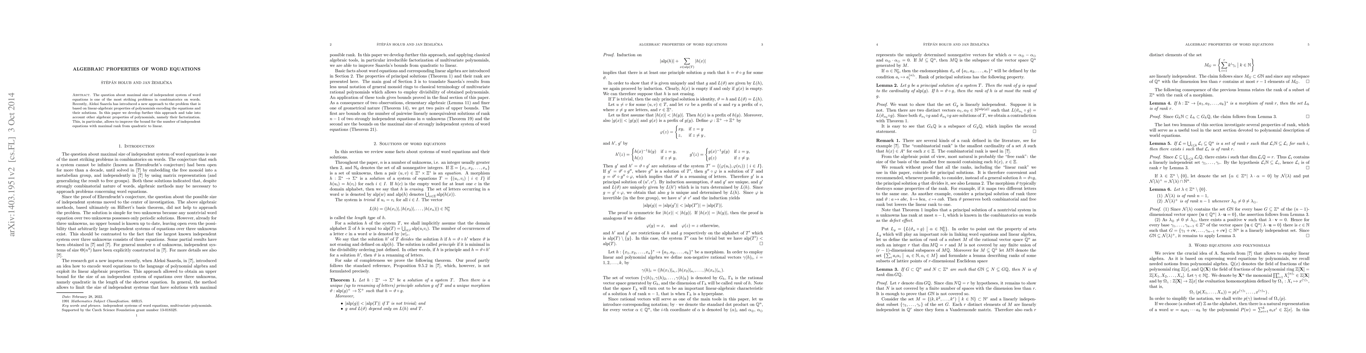 The question about maximal size of independent system of word equations is one of the most striking problems in combinatorics on words. Recently, Aleksi Saarela has introduced a new approach to the problem that is based on linear-algebraic properties of polynomials encoding the equations and their solutions. In this paper we develop further this approach and take into account other algebraic properties of polynomials, namely their factorization. This, in particular, allows to improve the bound for the number of independent equations with maximal rank from quadratic to linear.