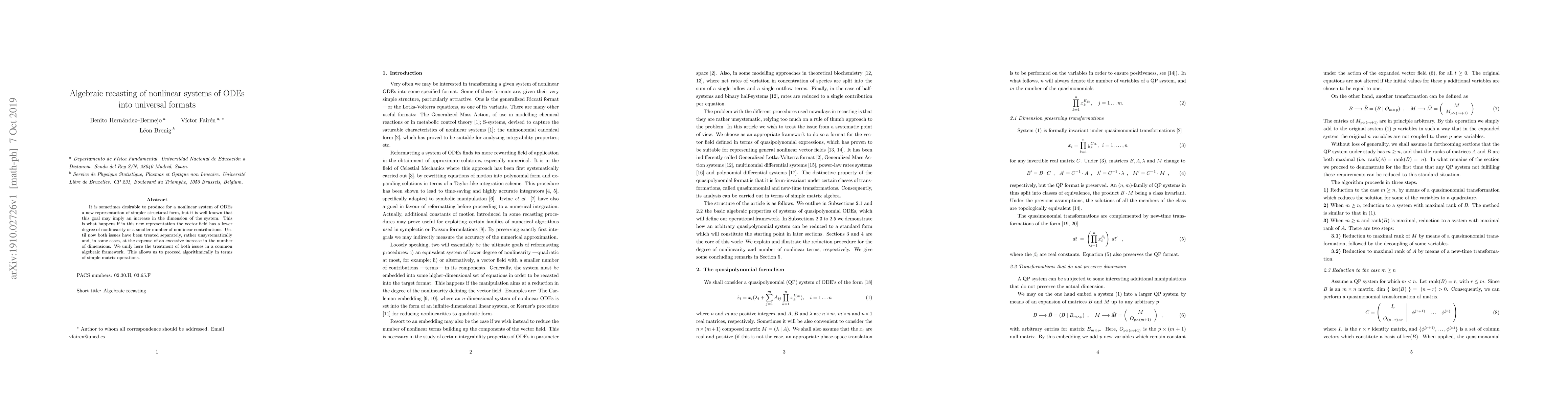 Researchers develop an algebraic framework to recast nonlinear systems of ODEs into simpler representations with reduced nonlinearity, improving efficiency and reducing dimensionality.