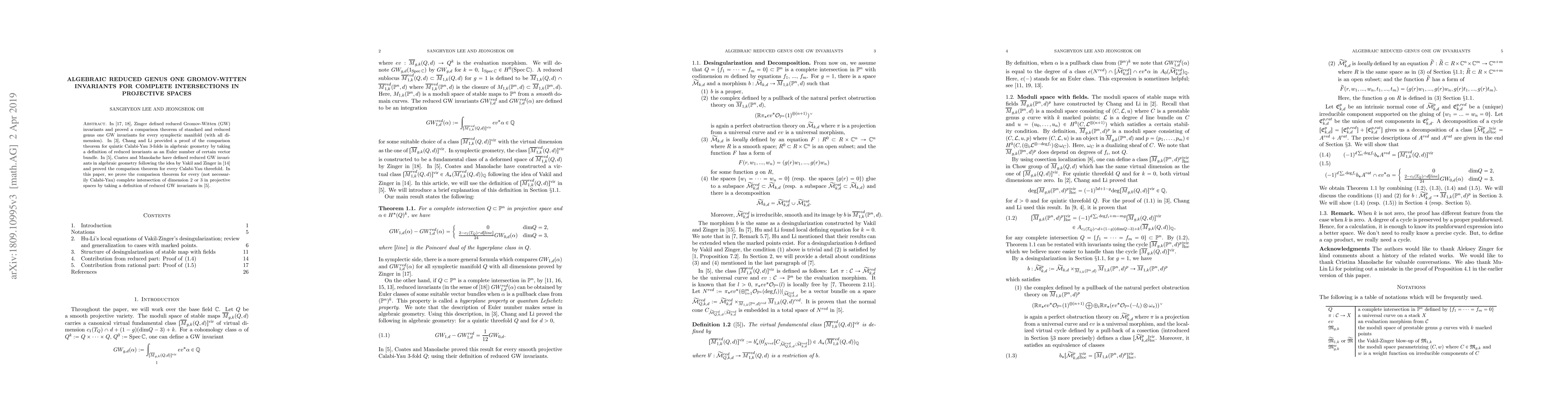 The paper introduces a rigorous proof of the comparison theorem for reduced and standard genus one GW invariants for complete intersections in projective spaces, utilizing a consistent definition of reduced invariants as an Euler number of a certain vector bundle.