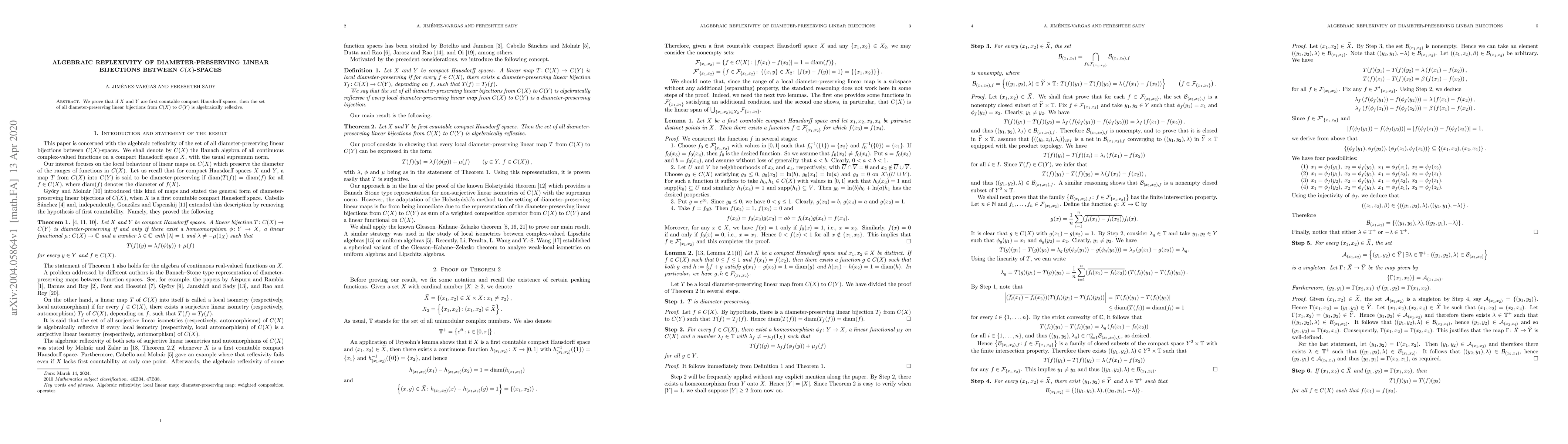 This research proves that for first countable compact Hausdorff spaces X and Y, all diameter-preserving linear bijections from C(X) to C(Y) form an algebraically reflexive set.
