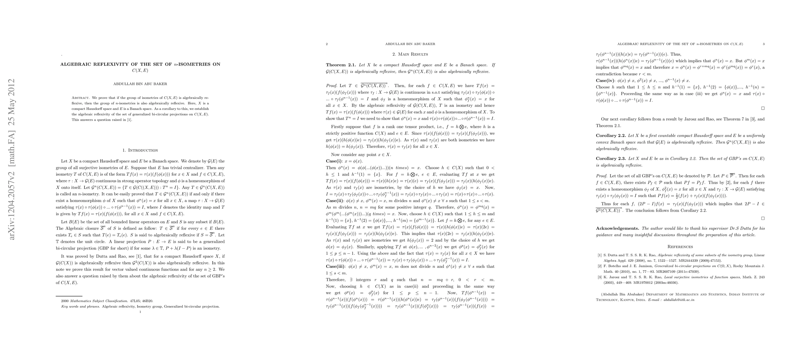 We prove that if the group of isometries of C(X,E) is algebraically reflexive, then the group of n-isometries is also algebraically reflexive. Here, X is a compact Hausdorff space and E is a Banach space. As a corollary to this, we establish the algebraic reflexivity of the set of generalized bi-circular projections on C(X,E).