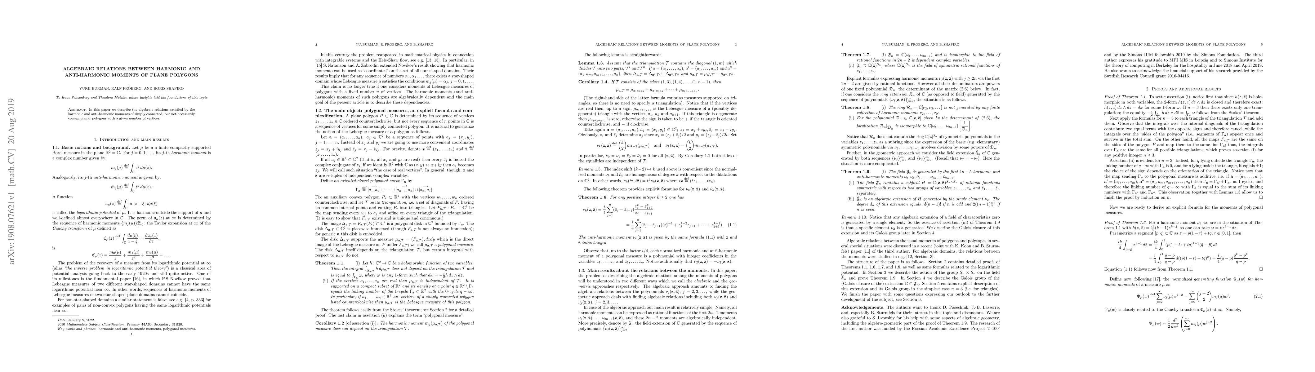 The paper investigates algebraic relations between moments of plane polygons with a given number of vertices, focusing on harmonic and anti-harmonic moments.