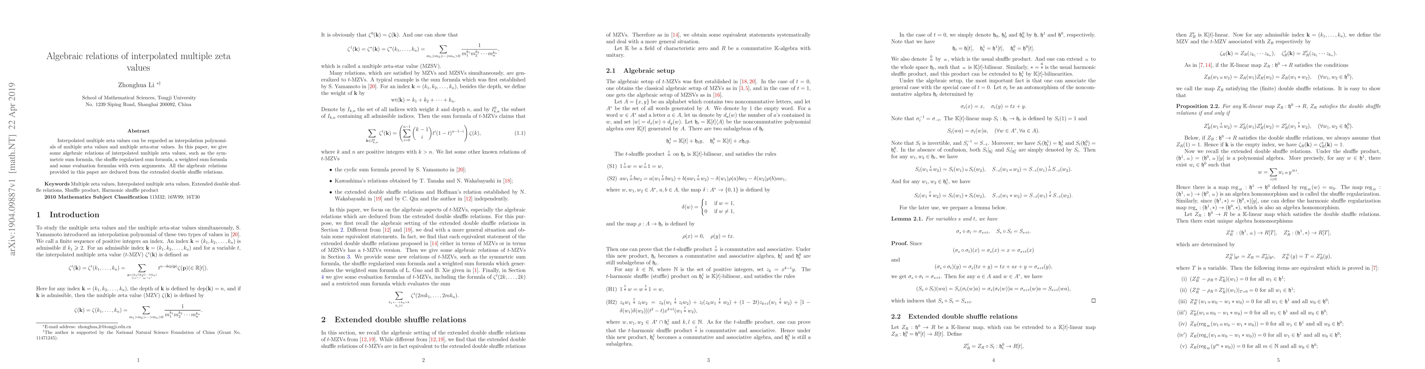 This paper presents algebraic relations for interpolated multiple zeta values, including symmetric sum, shuffle regularized sum, and weighted sum formulas, all derived from extended double shuffle relations. Evaluation formulas for even arguments are also provided.