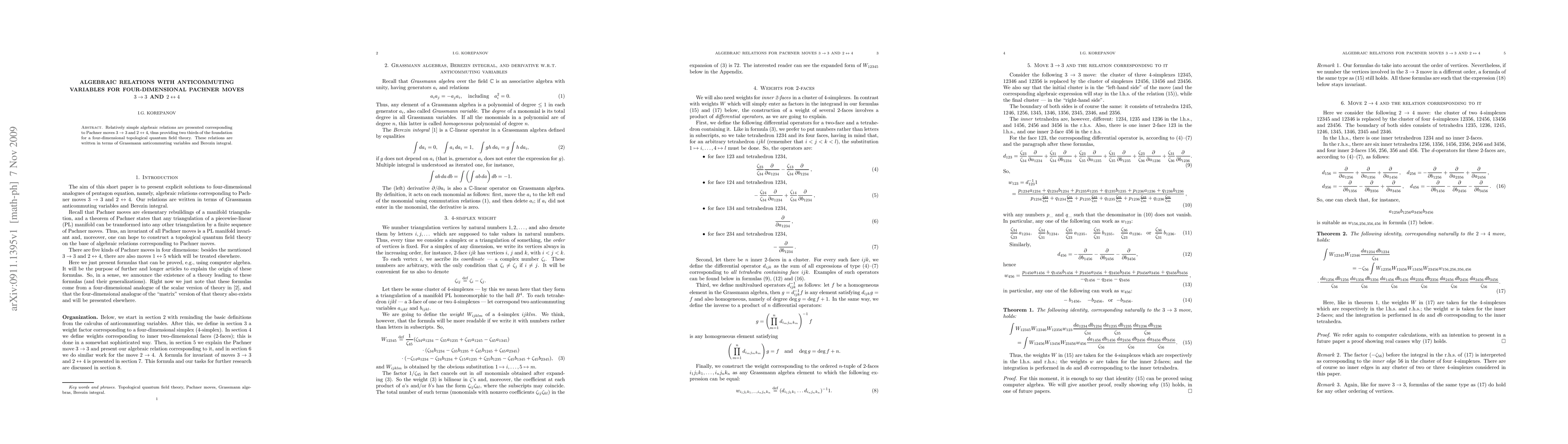 Relatively simple algebraic relations are presented corresponding to Pachner moves 3 -> 3 and 2 <-> 4, thus providing two thirds of the foundation for a four-dimensional topological quantum field theory. These relations are written in terms of Grassmann anticommuting variables and Berezin integral.