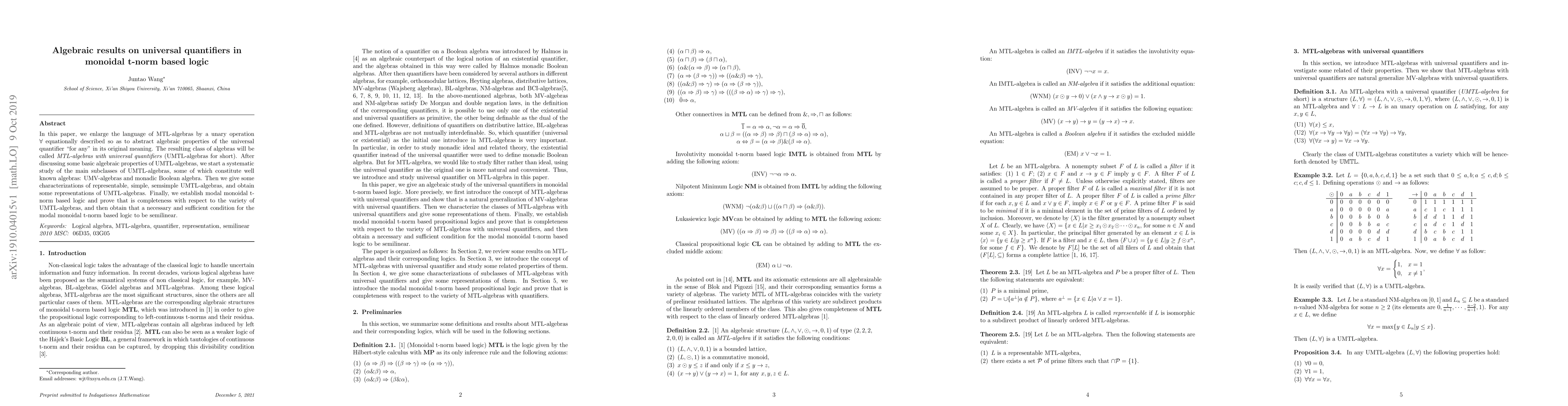 Researchers developed a new class of algebras with universal quantifiers, enabling them to study modal monoidal t-norm based logic in detail, including its completeness and semilinearity conditions.