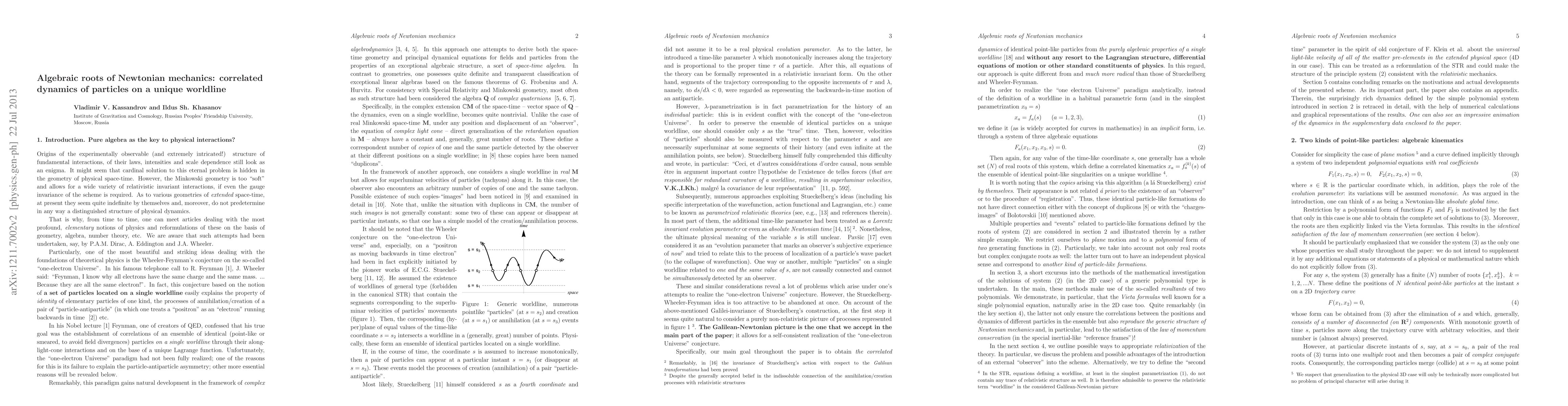 In the development of the old ideas of Stueckelberg-Wheeler-Feynman on the "one-electron Universe", we study the purely algebraic dynamics of the ensemble of(two kinds of) identical point-like particles. These are represented by the(real and complex conjugate) roots of a generic polynomial system of equations that implicitly defines a single "worldline". The dynamics includes events of "merging" of a pair of particles modelling the annihilation/creation processes. Correlations in the location and motion of the particles-roots relate, in particular, to the Vieta formulas. After a special choice of the inertial-like reference frame, the linear Vieta formulas guarantee that, for any worldline, the law of (non-relativistic) momentum conservation is identically satisfied. Thus, the general structure of Newtonian mechanics follows from the algebraic properties of a worldline alone. Some considerations on relativization of the scheme are presented. A simple example of, unexpectedly rich, "polynomial dynamics" is retraced in detail and illustrated via an animation(available from ancillary file enclosed)