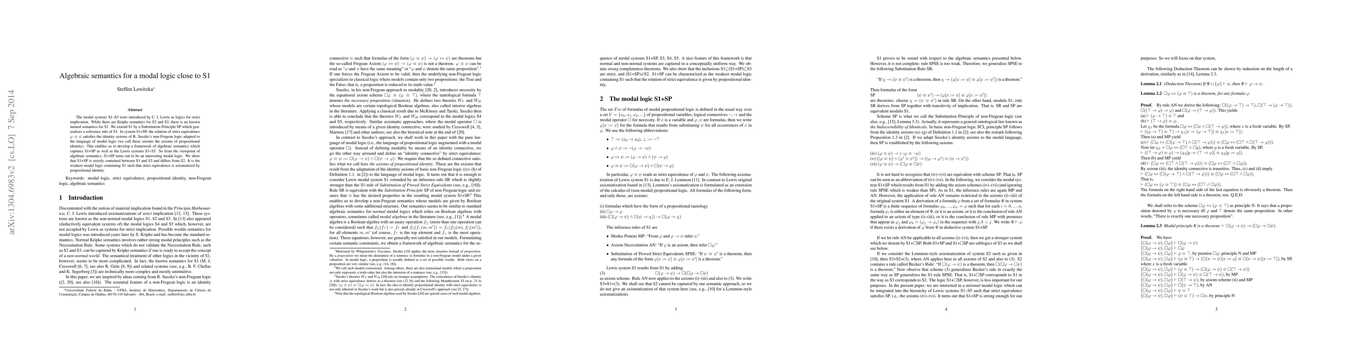 The paper introduces an algebraic semantics for a modal logic extending S1 with a Substitution Principle, showing it captures S1+SP and Lewis systems S3-S5, while lying strictly between S1 and S3 and differing from S2. This framework axiomatizes strict equivalence using propositional identity.