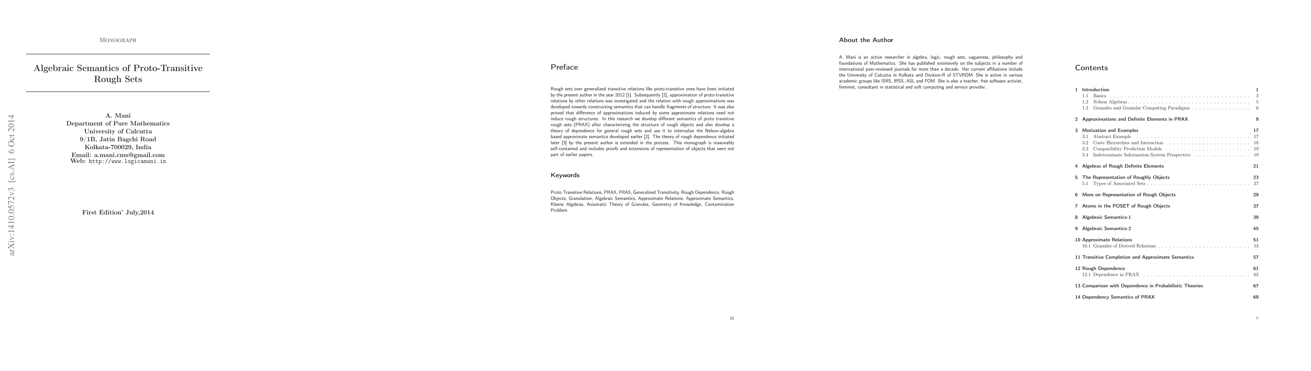 Rough sets over generalized transitive relations like proto-transitive ones had been initiated by the present author in the year 2012. Subsequently, approximation of proto-transitive relations by other relations was investigated and the relation with rough approximations was developed towards constructing semantics that can handle fragments of structure. It was also proved that difference of approximations induced by some approximate relations need not induce rough structures. In this research we develop different semantics of proto transitive rough sets (PRAX) after characterizing the structure of rough objects and also develop a theory of dependence for general rough sets and use it to internalize the Nelson-algebra based approximate semantics developed earlier. The theory of rough dependence initiated later by the present author is extended in the process. This monograph is reasonably self-contained and includes proofs and extensions of representation of objects that were not part of earlier papers.