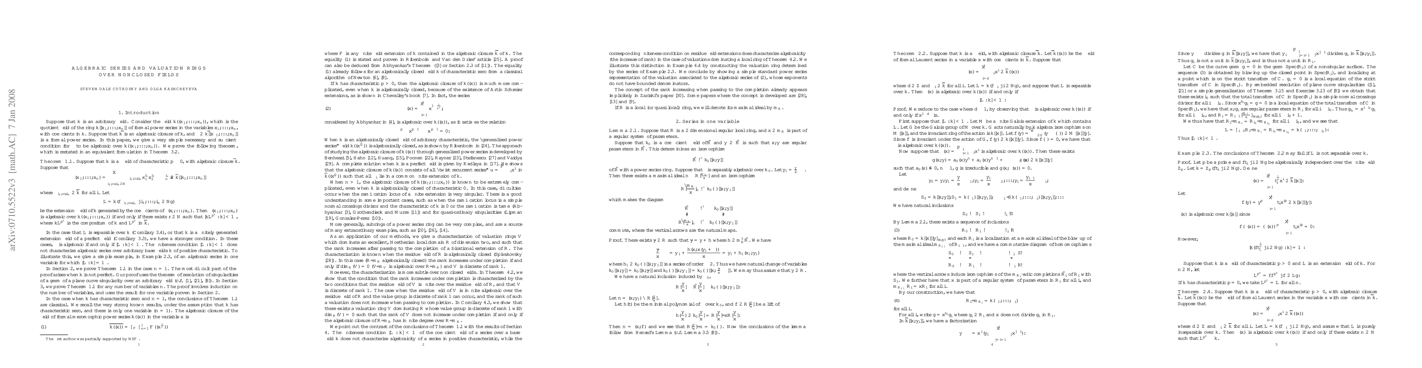 Suppose that $k$ is an arbitrary field. Consider the field $k((x_1,...,x_n))$, which is the quotient field of the ring $k[[x_1,...,x_n]]$ of formal power series in the variables $x_1,...,x_n$, with coefficients in $k$. Suppose that $\sigma$ is a formal power series in $x_1,...,x_n$ with coefficints in the algebraic closure of $k$. We give a very simple necessary and sufficient condition for $\sigma$ to be algebraic over $k((x_1,...,x_n))$. As an application of our methods, we give a characterization of valuation rings $V$ which dominate an excellent, Noetherian local domain $R$ of dimension two, and such that the rank increases after passing to the completion of a birational extension of $R$.