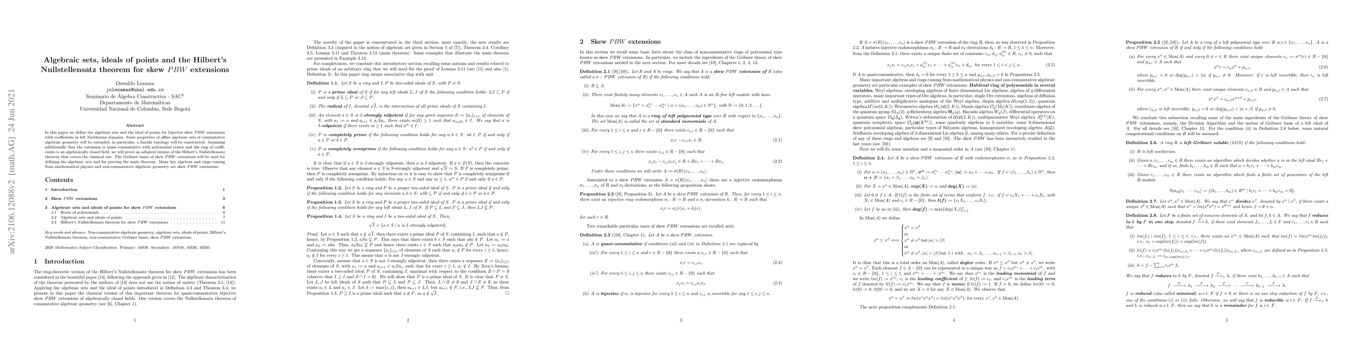 In this paper we define the algebraic sets and the ideal of points for bijective skew PBW extensions with coefficients in left Noetherian domains. Some properties of affine algebraic sets of commutative algebraic geometry will be extended, in particular, a Zariski topology will be constructed. Assuming additionally that the extension is quasi-commutative with polynomial center and the ring of coefficients is an algebraically closed field, we will prove an adapted version of the Hilbert's Nullstellensatz theorem that covers the classical one. The Gr\"obner bases of skew PBW extensions will be used for defining the algebraic sets and for proving the main theorem. Many key algebras and rings coming from mathematical physics and non-commutative algebraic geometry are skew PBW extensions.