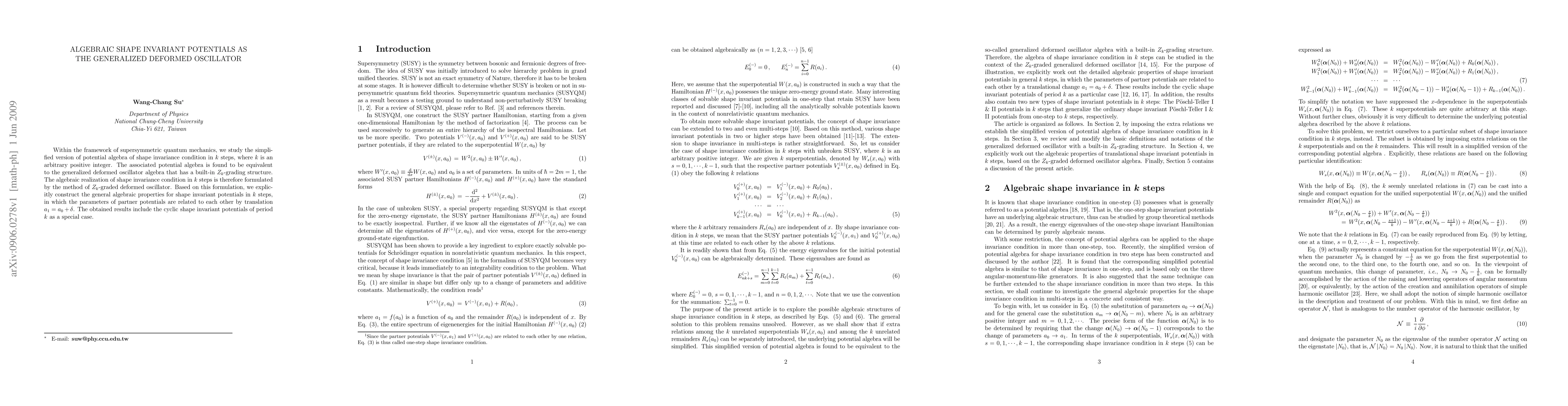 This paper explores the algebraic structure of shape invariant potentials within supersymmetric quantum mechanics, showing their equivalence to generalized deformed oscillator algebras with a Z_k-grading. It constructs the algebraic properties of these potentials, revealing a relationship between partner potential parameters and identifying cyclic shape invariant potentials of period k as a special case.