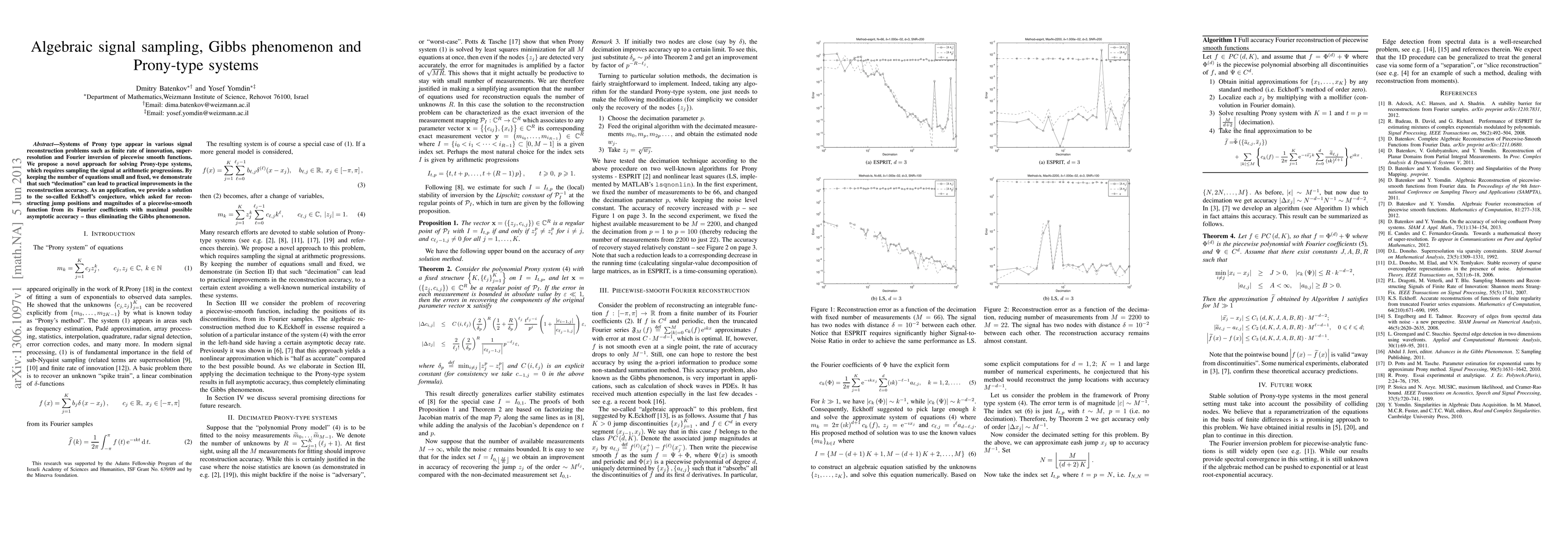 Systems of Prony type appear in various signal reconstruction problems such as finite rate of innovation, superresolution and Fourier inversion of piecewise smooth functions. We propose a novel approach for solving Prony-type systems, which requires sampling the signal at arithmetic progressions. By keeping the number of equations small and fixed, we demonstrate that such "decimation" can lead to practical improvements in the reconstruction accuracy. As an application, we provide a solution to the so-called Eckhoff's conjecture, which asked for reconstructing jump positions and magnitudes of a piecewise-smooth function from its Fourier coefficients with maximal possible asymptotic accuracy -- thus eliminating the Gibbs phenomenon.