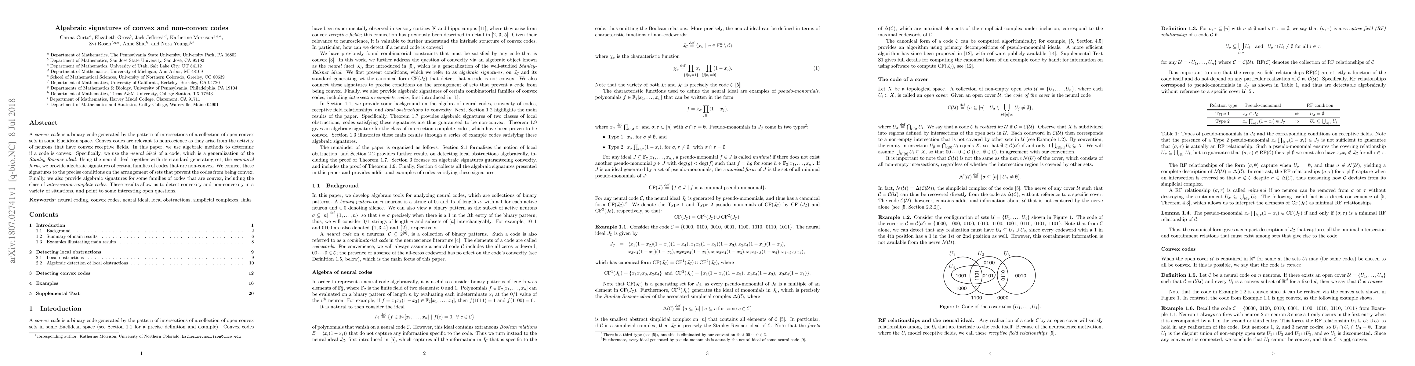 This paper explores algebraic methods to determine the convexity of binary codes generated by intersections of open convex sets in Euclidean space, particularly relevant in neuroscience. It uses the neural ideal and its canonical form to provide algebraic signatures distinguishing convex and non-convex codes, connecting these signatures to conditions preventing convexity and identifying signatures for intersection-complete convex codes.
