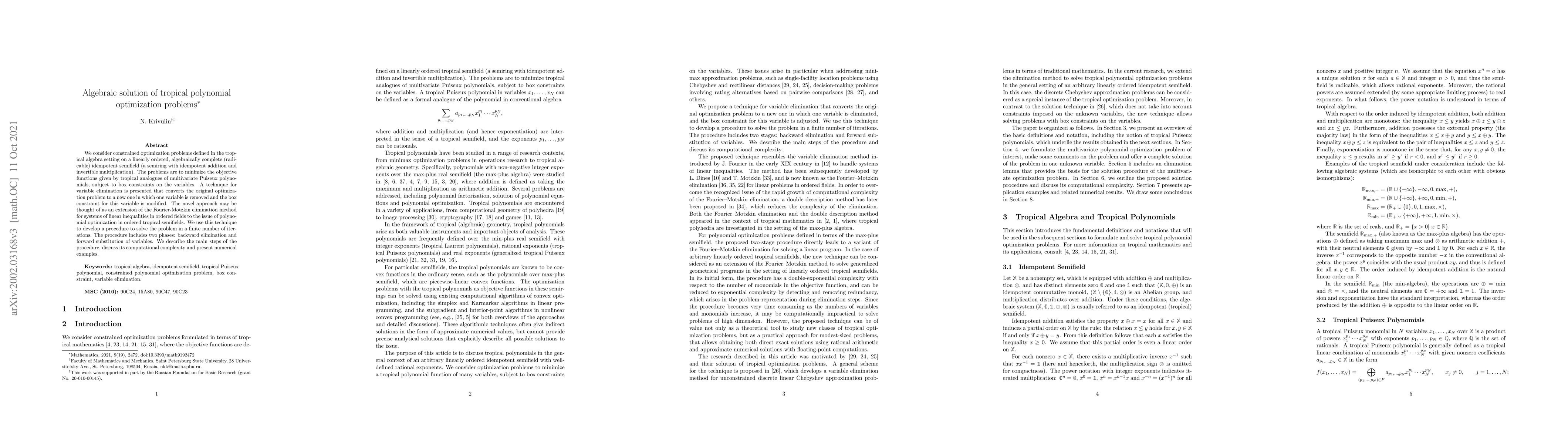 This paper presents an algebraic method for solving optimization problems in tropical algebra, transforming the original problem through variable elimination and box constraint modification. The proposed technique extends the Fourier-Motzkin elimination method and includes backward elimination and forward substitution phases, achieving a finite solution in iterations.