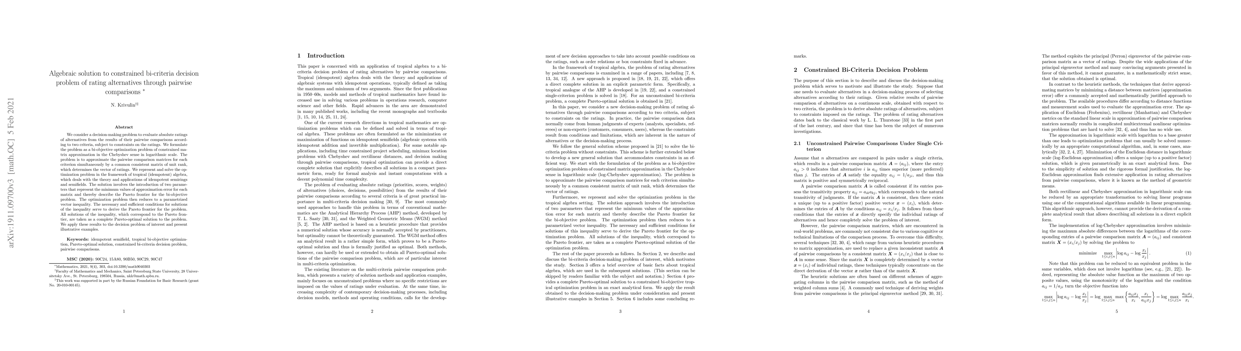 This paper formulates a constrained bi-criteria decision problem for evaluating alternative ratings via pairwise comparisons, solving it using tropical algebra. The solution identifies the Pareto frontier through a parametrized vector inequality, providing a complete set of optimal ratings.