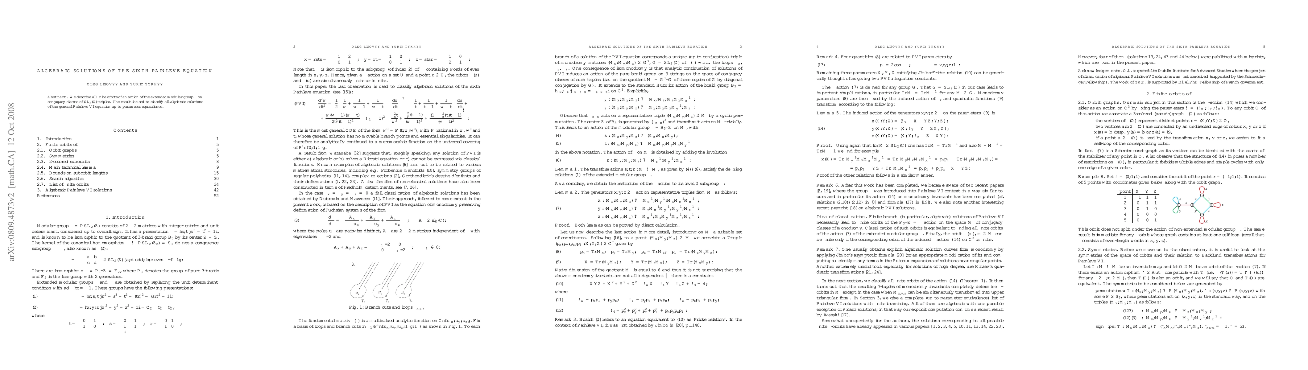 This paper classifies all algebraic solutions of the Painleve VI equation by analyzing the finite orbits of the extended modular group's action on SL(2,C)-triples, achieving a complete classification up to parameter equivalence.