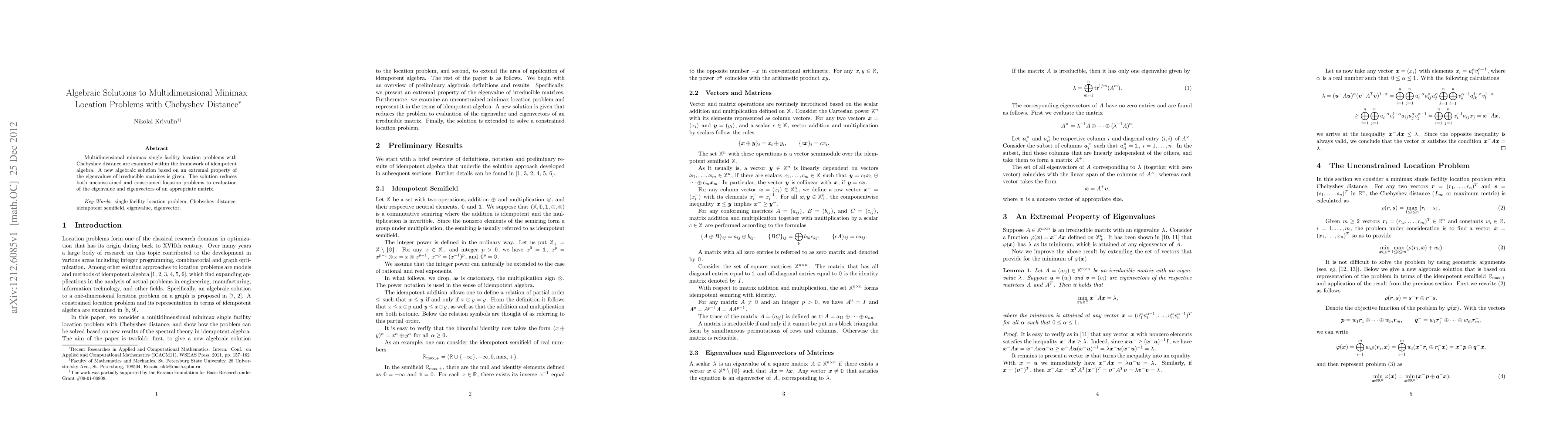 This paper presents an algebraic solution for multidimensional minimax single facility location problems using Chebyshev distance, employing idempotent algebra. The method leverages the extremal properties of eigenvalues of irreducible matrices to simplify both unconstrained and constrained location problems to matrix eigenvalue evaluations.