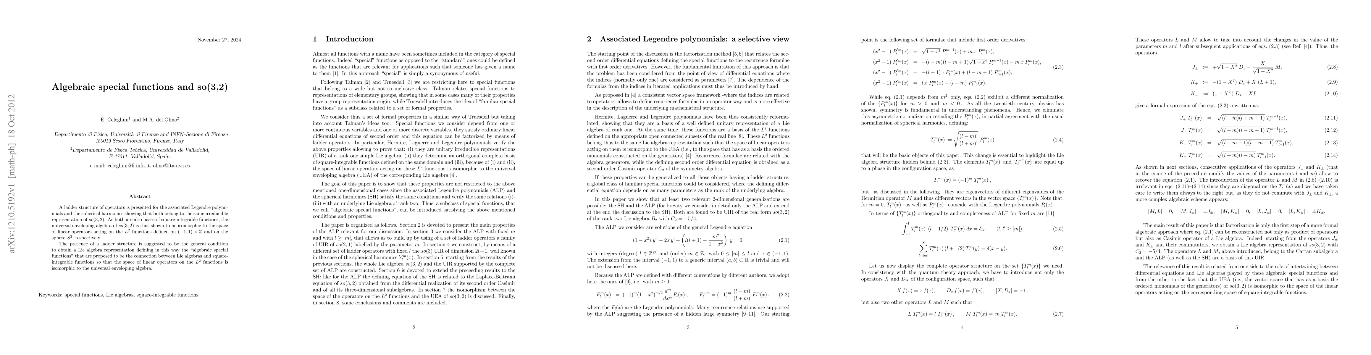 This paper demonstrates a ladder structure for associated Legendre polynomials and spherical harmonics, showing they both belong to the same irreducible representation of the so(3,2) Lie algebra. It proposes "algebraic special functions" as a bridge between Lie algebras and square-integrable functions, establishing an isomorphism between the universal enveloping algebra of so(3,2) and the space of linear operators acting on L^2 functions on (-1,1) x Z and S^2.