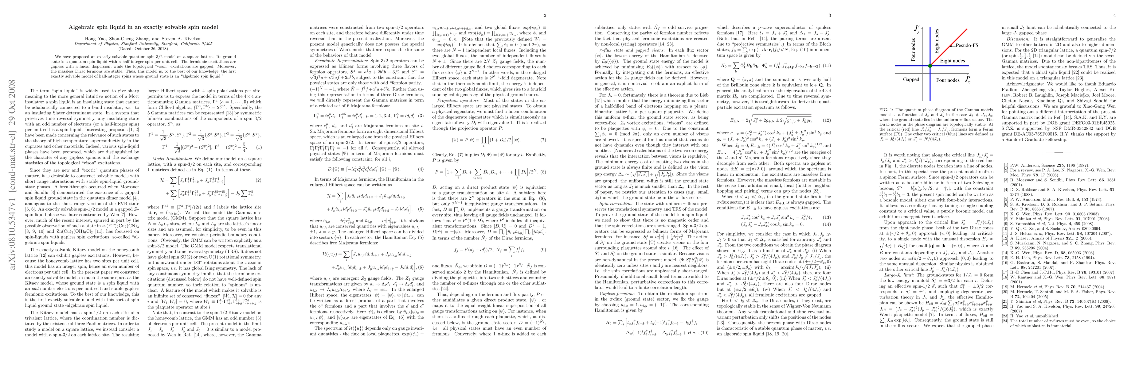 The paper proposes an exactly solvable quantum spin-3/2 model on a square lattice with a ground state exhibiting algebraic spin liquid characteristics, featuring gapless fermionic excitations and gapped topological vison excitations. This model represents the first known exactly solvable example of a half-integer spin system with an algebraic spin liquid ground state.
