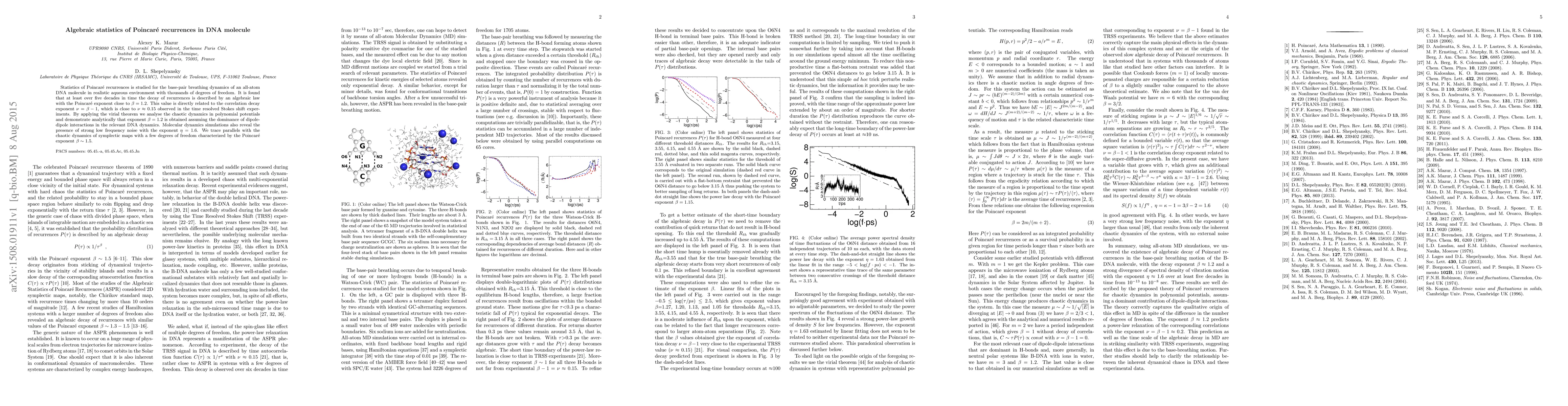This study investigates the algebraic statistics of Poincar\'e recurrences in DNA molecule dynamics, revealing an algebraic decay law with a Poincar\'e exponent of $\beta=1.2$ over five decades in time, closely matching the correlation decay exponent $\nu=0.15$ observed in experiments. The analysis connects this behavior to dipole-dipole interactions in the DNA dynamics.