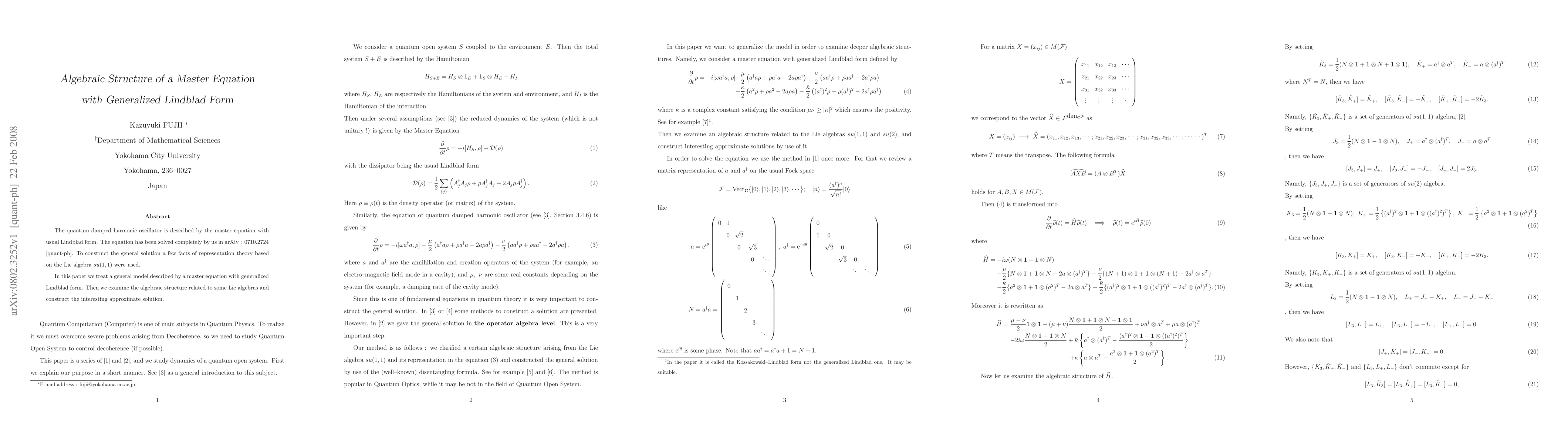 This paper explores the algebraic structure of a master equation with a generalized Lindblad form, extending the previously solved quantum damped harmonic oscillator model. It utilizes representation theory based on Lie algebra $su(1,1)$ to construct an approximate solution and examines related Lie algebras.
