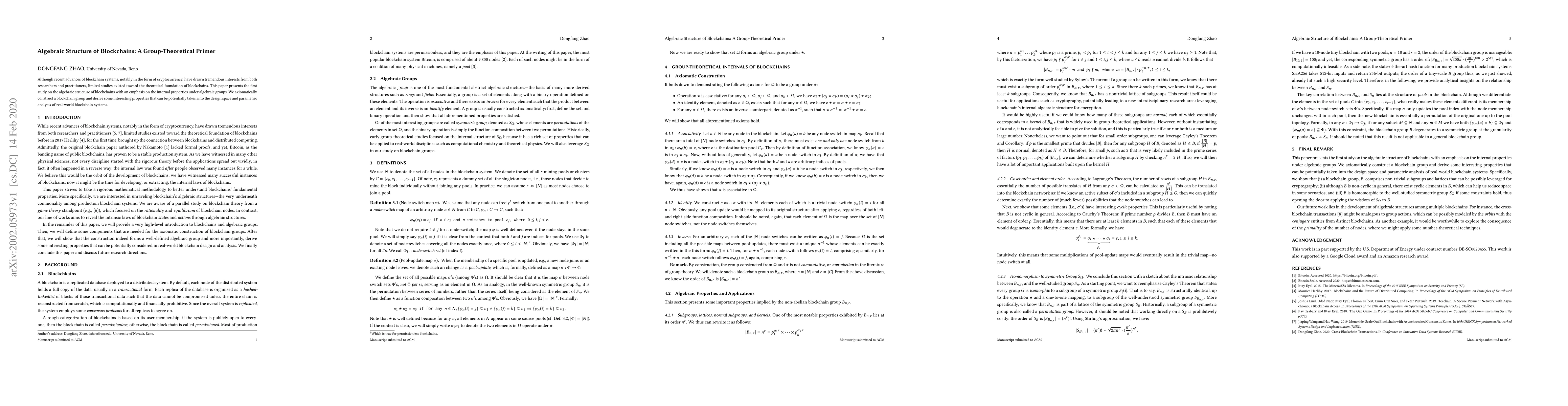 Although recent advances of blockchain systems, notably in the form of cryptocurrency, have drawn tremendous interests from both researchers and practitioners, limited studies existed toward the theoretical foundation of blockchains. This paper presents the first study on the algebraic structure of blockchains with an emphasis on the internal properties under algebraic groups. We axiomatically construct a blockchain group and derive some interesting properties that can be potentially taken into the design space and parametric analysis of real-world blockchain systems.
