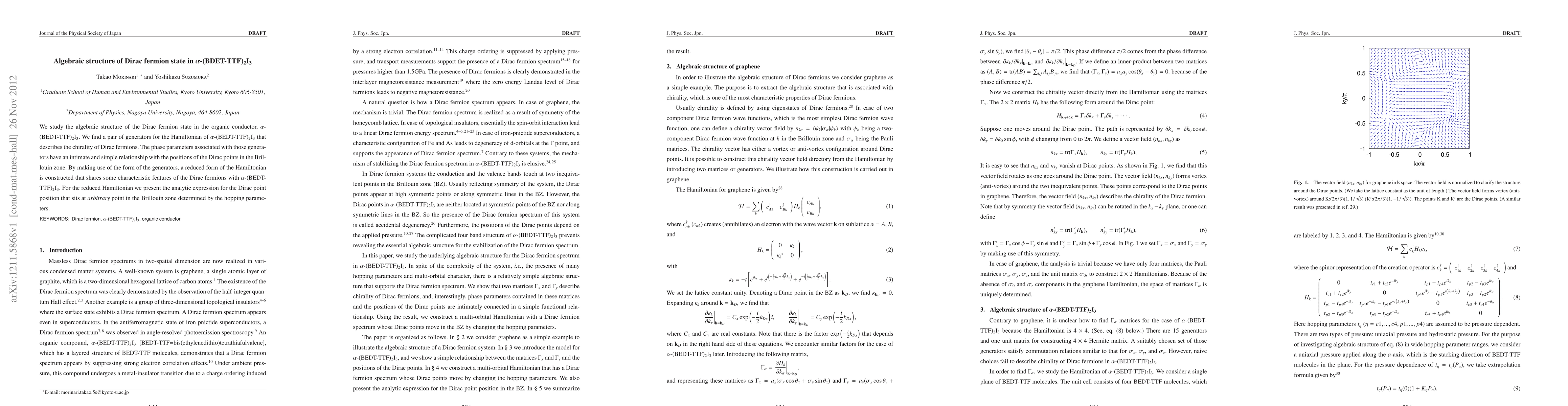 This paper investigates the algebraic structure of Dirac fermions in the organic conductor α-(BDET-TTF)₂I₃, identifying generators that capture the chirality of Dirac fermions. It establishes a relationship between phase parameters and Dirac points' positions, constructing a reduced Hamiltonian that maintains key Dirac fermion characteristics and analytically determines the position of the Dirac point in the Brillouin zone.