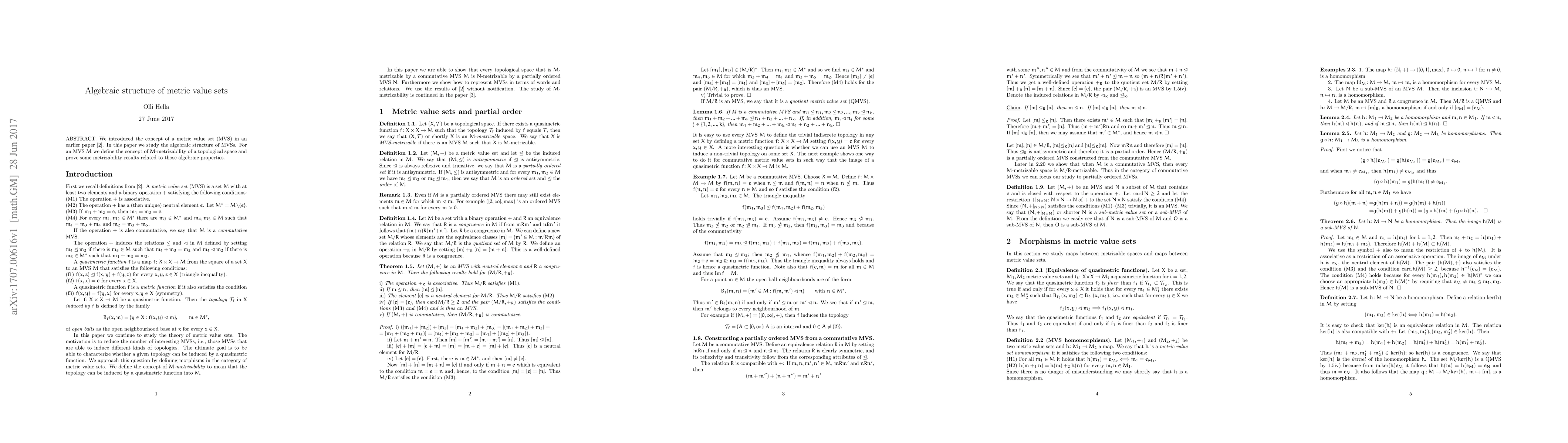 We introduced the concept of a metric value set (MVS) in an earlier paper \cite{GM}. In this paper we study the algebraic structure of MVSs. For an MVS $M$ we define the concept of $M$-metrizability of a topological space and prove some metrizability results related to those algebraic properties.