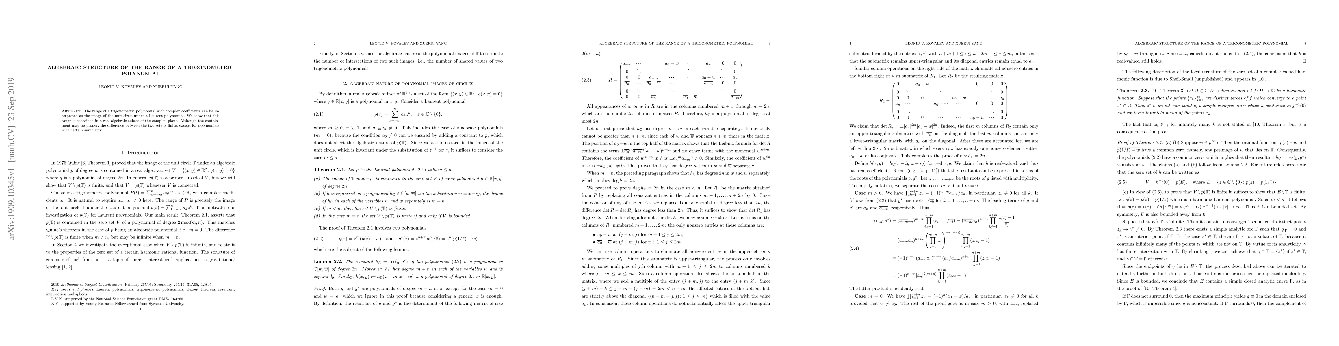 Summary: This paper demonstrates that the range of a trigonometric polynomial with complex coefficients, viewed as the image of the unit circle under a Laurent polynomial, lies within a real algebraic subset of the complex plane, with the difference between the two sets being finite, except for polynomials with specific symmetries.