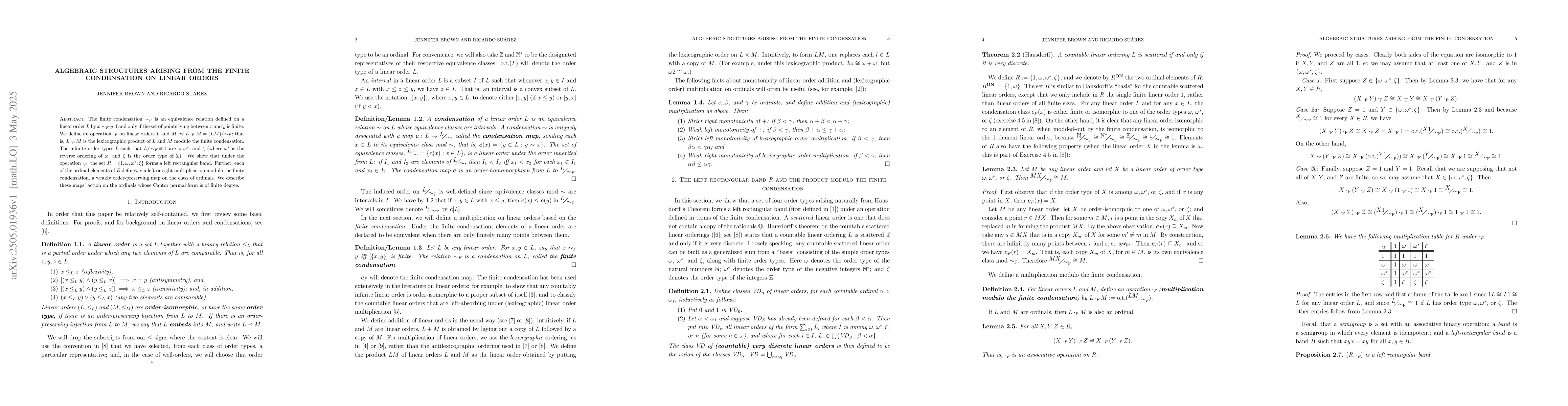 The research presents a novel approach to examining algebraic structures through the lens of finite condensation on linear orders, providing insights into how equivalence relations under specific operations can define unique algebraic properties.