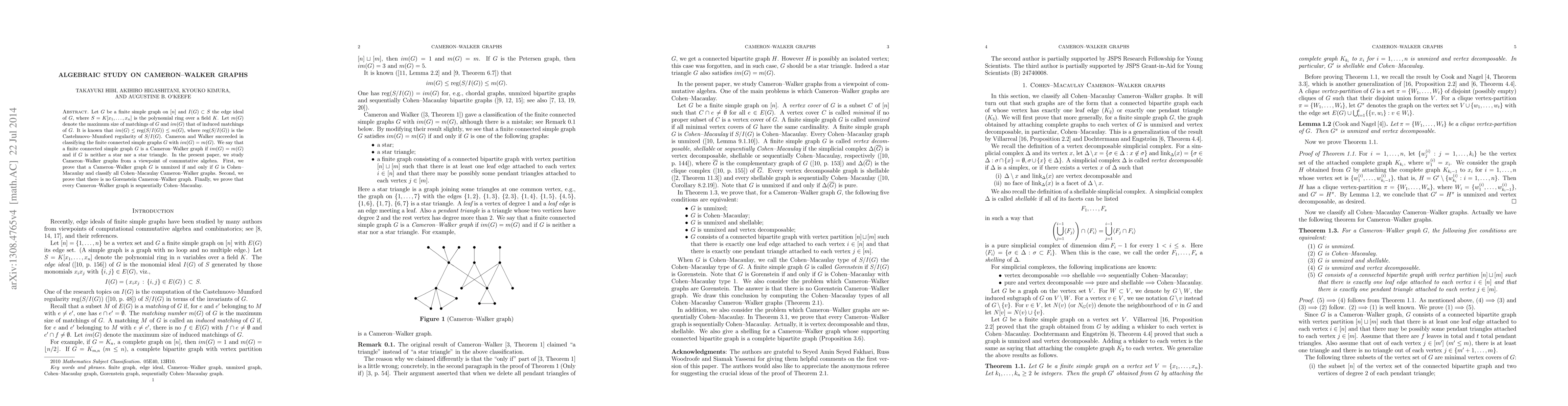 Let $G$ be a finite simple graph on $[n]$ and $I(G) \subset S$ the edge ideal of $G$, where $S = K[x_{1}, \ldots, x_{n}]$ is the polynomial ring over a field $K$. Let $m(G)$ denote the maximum size of matchings of $G$ and $im(G)$ that of induced matchings of $G$. It is known that $im(G) \leq \text{reg}(S/I(G)) \leq m(G)$, where $\text{reg}(S/I(G))$ is the Castelnuovo-Mumford regularity of $S/I(G)$. Cameron and Walker succeeded in classifying the finite connected simple graphs $G$ with $im(G) = m(G)$. We say that a finite connected simple graph $G$ is a Cameron-Walker graph if $im(G) = m(G)$ and if $G$ is neither a star nor a star triangle. In the present paper, we study Cameron-Walker graphs from a viewpoint of commutative algebra. First, we prove that a Cameron-Walker graph $G$ is unmixed if and only if $G$ is Cohen-Macaulay and classify all Cohen-Macaulay Cameron-Walker graphs. Second, we prove that there is no Gorenstein Cameron-Walker graph. Finally, we prove that every Cameron--Walker graph is sequentially Cohen-Macaulay.