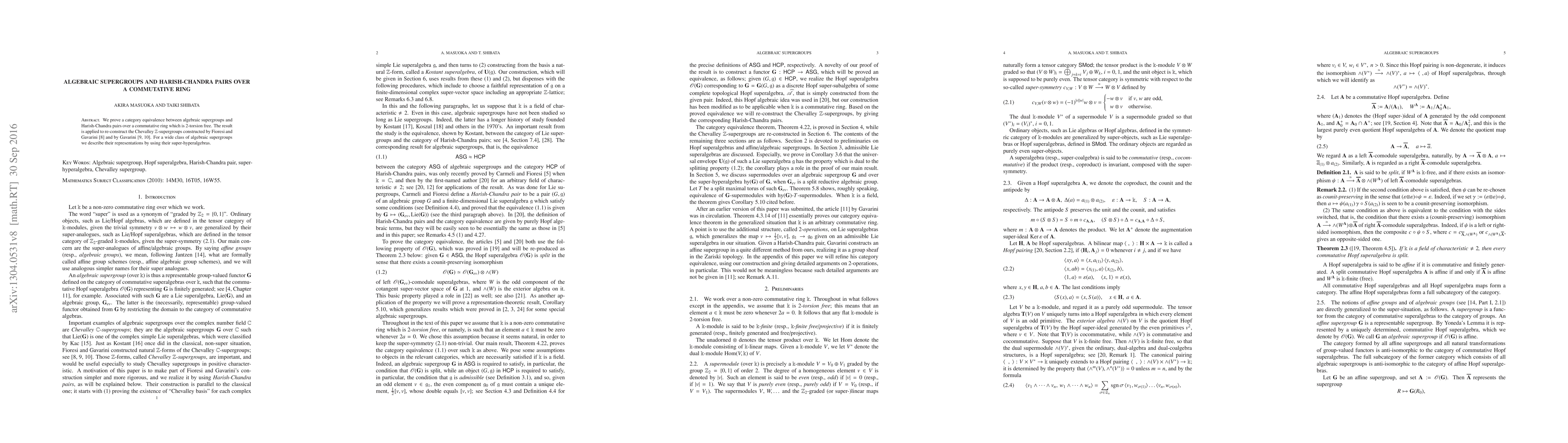 The paper establishes a category equivalence between algebraic supergroups and Harish-Chandra pairs over a $2$-torsion free commutative ring. It reconstructs Chevalley $\mathbb{Z}$-supergroups and describes representations of algebraic supergroups via their super-hyperalgebras.
