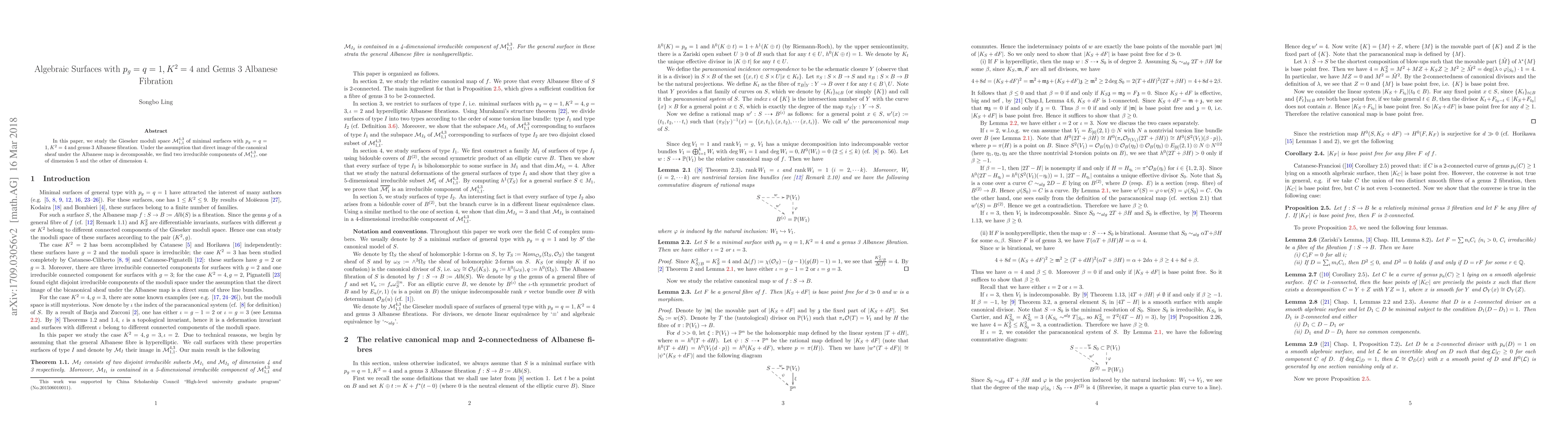 This paper investigates the Gieseker moduli space $\mathcal{M}_{1,1}^{4,3}$ for minimal algebraic surfaces characterized by $p_g=q=1$, $K^2=4$, and genus 3 Albanese fibration, identifying two irreducible components under the condition that the direct image of the canonical sheaf is decomposable: one of dimension 5 and another of dimension 4.