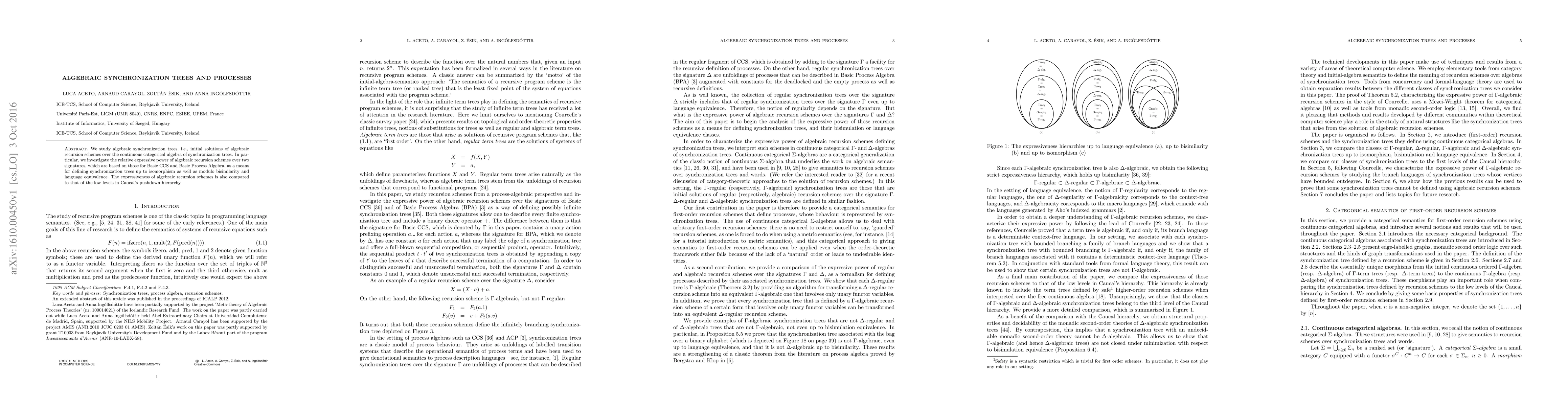 This paper explores algebraic synchronization trees, focusing on their initial solutions derived from algebraic recursion schemes. It compares the expressiveness of these schemes relative to Basic CCS and Basic Process Algebra, and assesses their equivalence to low levels in Caucal's pushdown hierarchy.