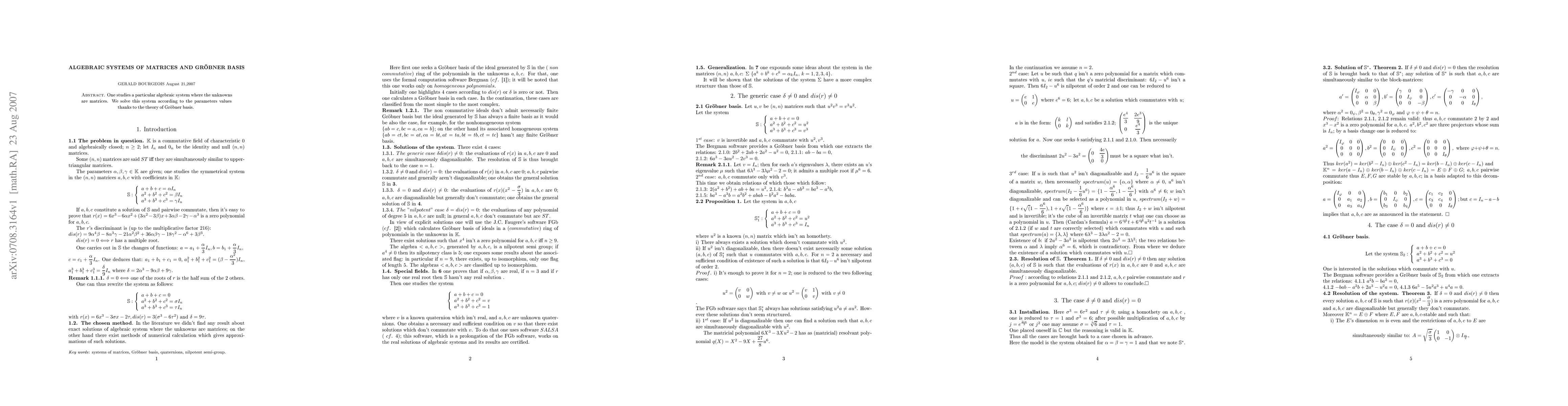 Summary: This research investigates an algebraic system defined by matrix unknowns, employing Grobner basis theory to solve the system based on parameter values. The study utilizes computational algebraic methods to derive solutions.